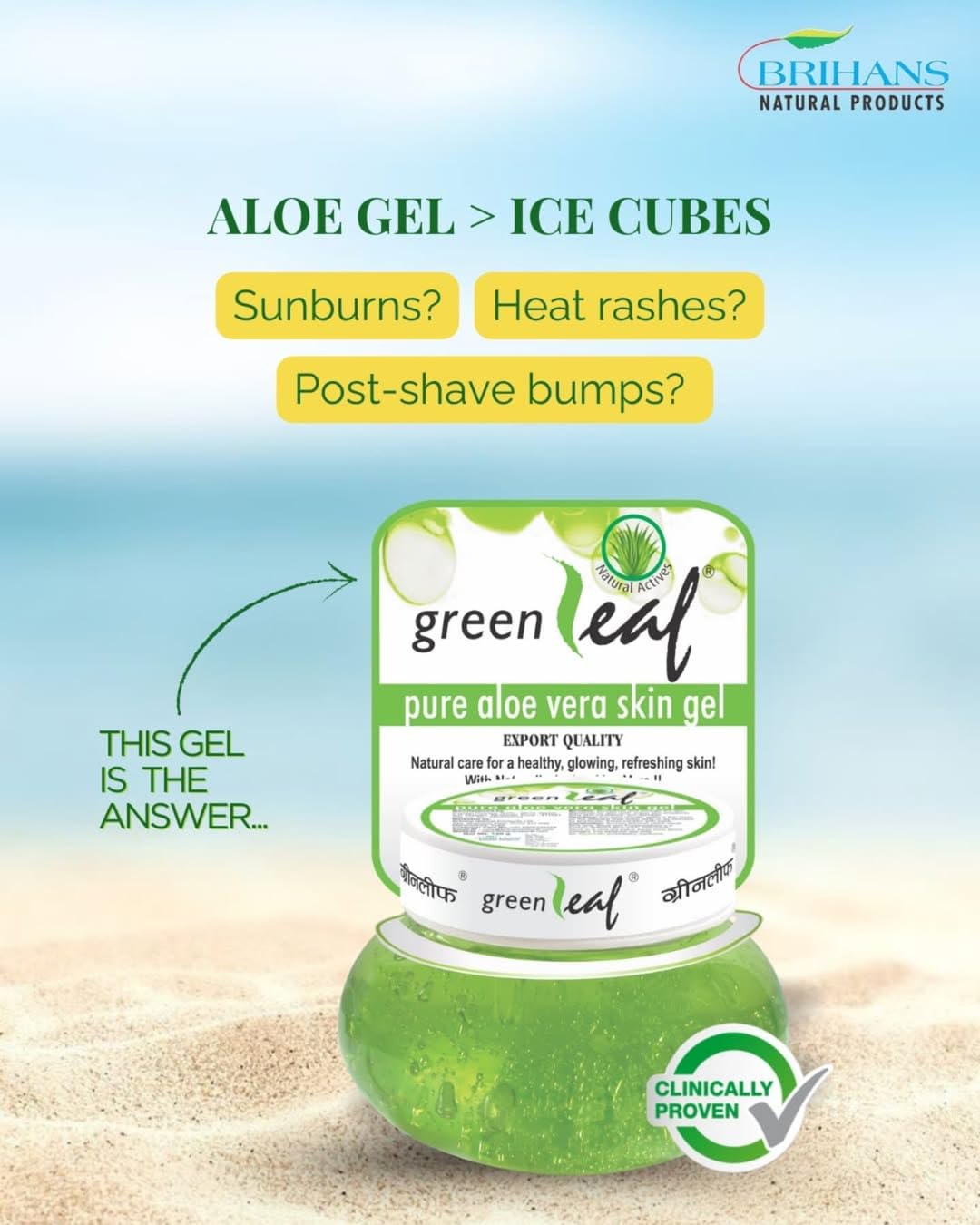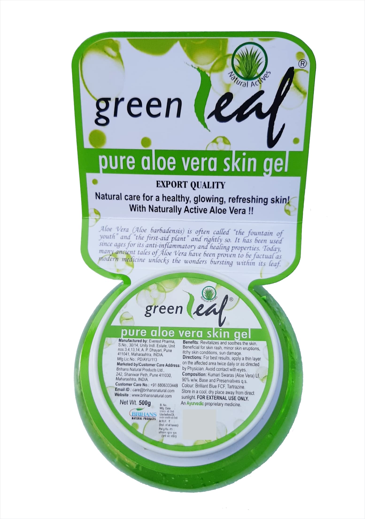 Greenleaf Aloe Vera Skin Gel with naturally active Aloe Vera soothes heals and repairs damaged skin. Improves the skin texture. Reduces inflammation. Beneficial for skin rash minor skin eruptions itchy skin conditions sun damage. Aloe Vera is often called âthe fountain of youthâ and âthe first-aid plantâ and rightly so. It has been used since ages for its anti-inflammatory and healing properties
