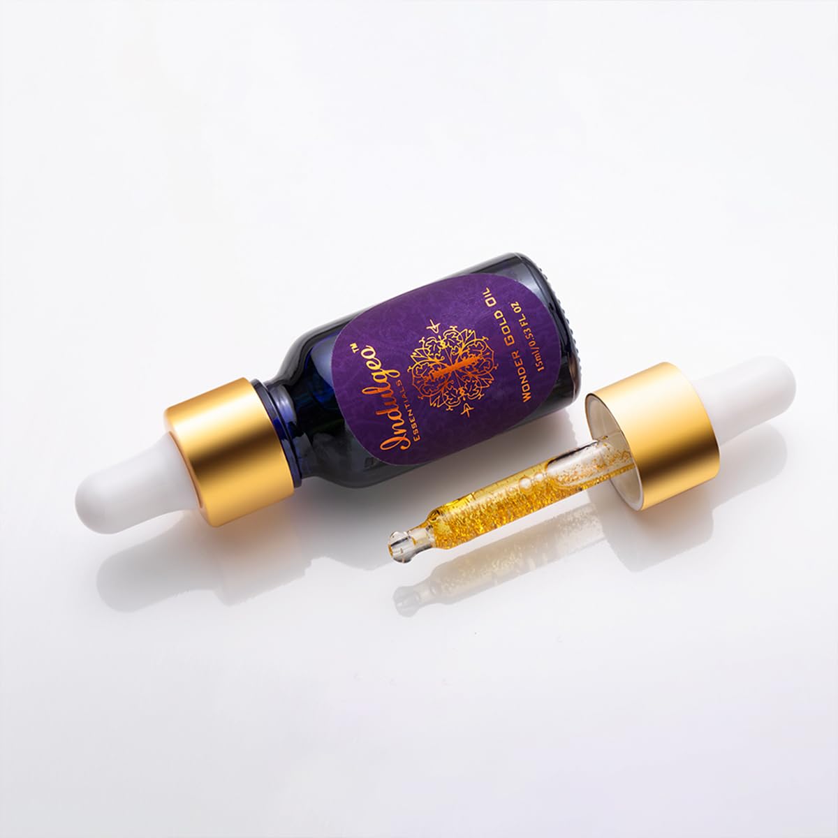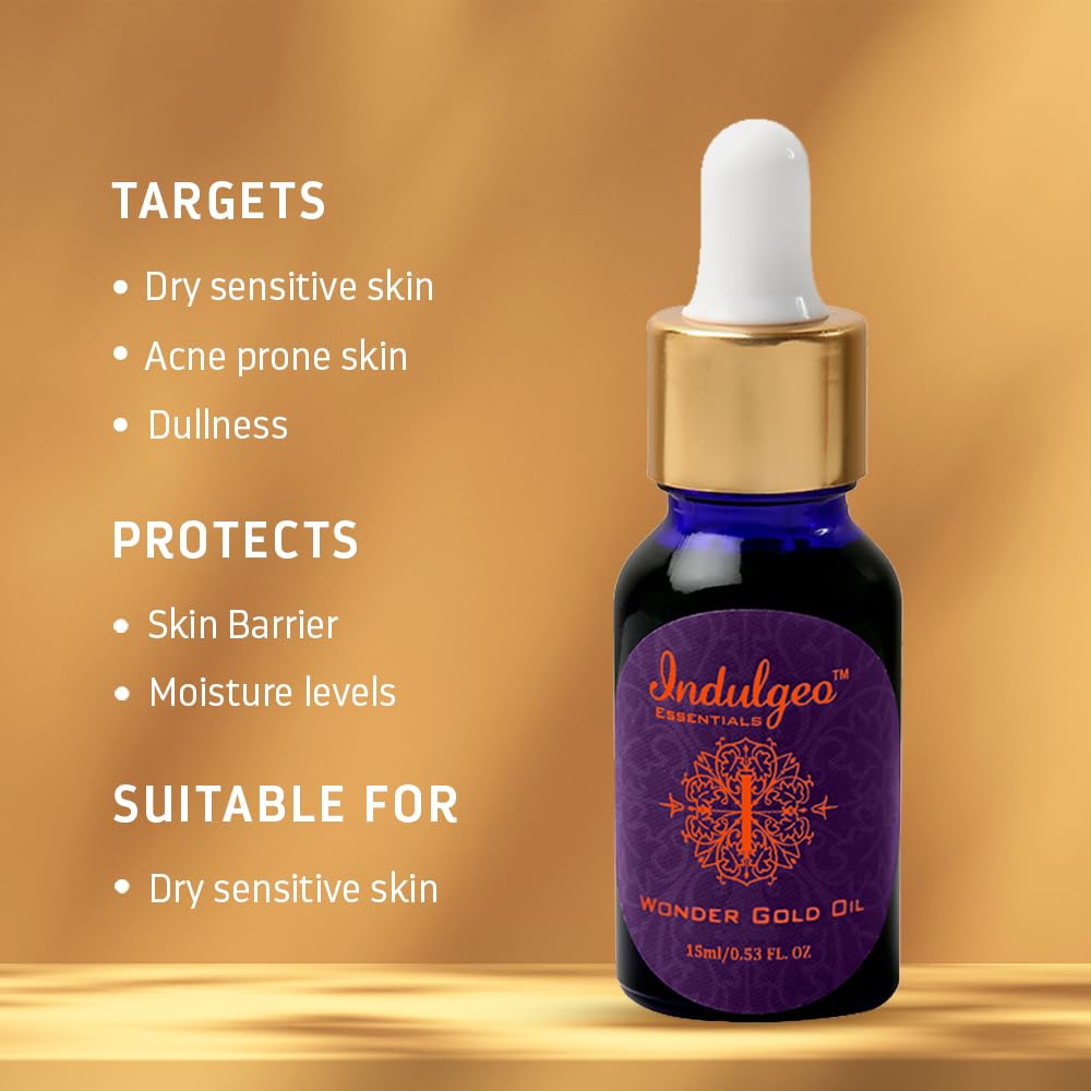Indulgeo Essentials Wonder Gold Oil (15 ml) | 24K Gold Infused Makeup Face Primer for Dry and Sensitive Skin | Help in Instant Glow Beauty Oil | Helps to Reduces Hyperpigmentation Fine Lines Anti-aging Natural SPF |Nourishment | Ayush Certified