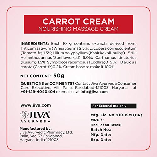 A luxurious massage cream that provides nourishment to the skin. The formative action of carrot is on the epidermal cells. Carrot oil is a powerful tanning accelerator. It also naturally s the damaging effects of UV radiation. Wheat germ oil is a highly rich unrefined oil that is one of the richest sources of vitamin E A and D. It also has a high content of proteins and lecithin. It restores a smooth radiance and elasticity to the skin.