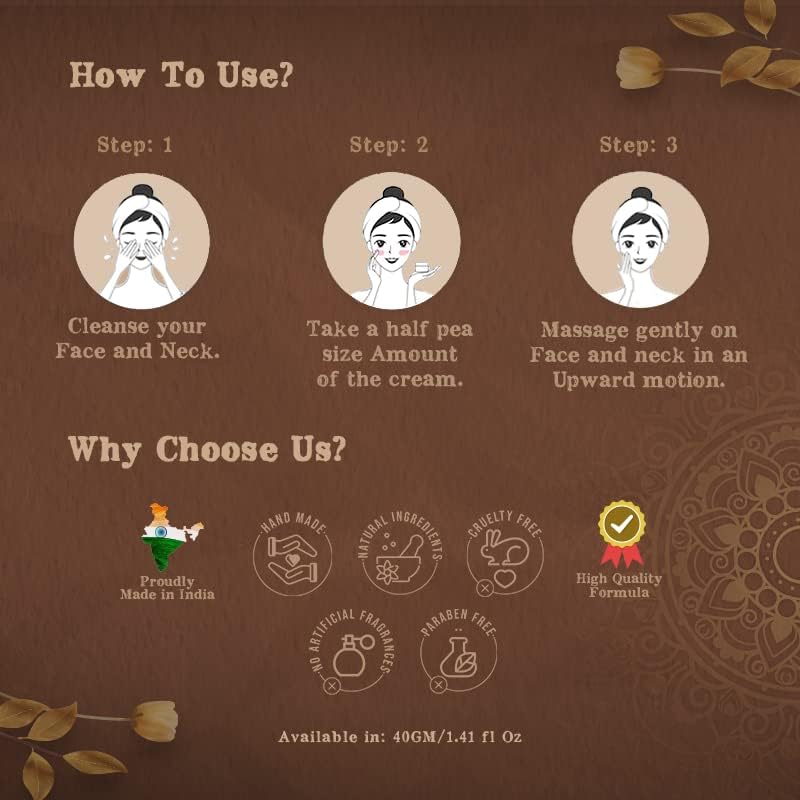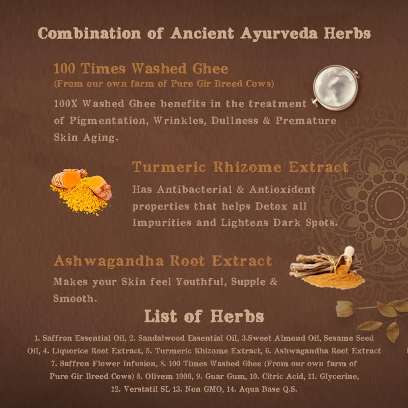 Non-greasy and light the Night Cream is the ideal overnight for giving your skin a healthy glow. During the day your skin is faced with countless problems from harmful sunlight to dust and pollution. This cream helps your skin relax repair and heal overnight. The Night Cream contains two highly potent and beneficial ingredients for the skin: Kesar and chandan. Kesar helps tone the skin with its antioxidant properties. It o unclogs skin pores giving your skin a more youthful look. Chandan helps and itching in the skin and o soothes damage caused by the harsh sun. Liquorice extract softens and brightens the skin while turmeric extract gives your skin a much needed from all the impurities. We use authentic cows ghee washed 100 times in our own farm to give your skin natural nutrients. The long term benefits of using this cream nurtures the true nature of your skin allowing it to overcome all the impurities. Your skin deserves to look and feel healthy moisturized and glowing. With our Night Cream your skin has the freedom to be its best version.