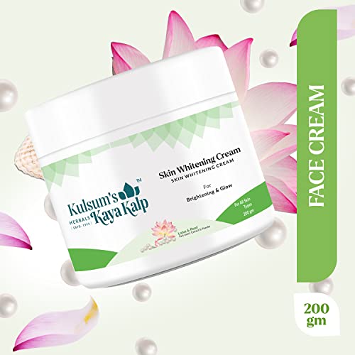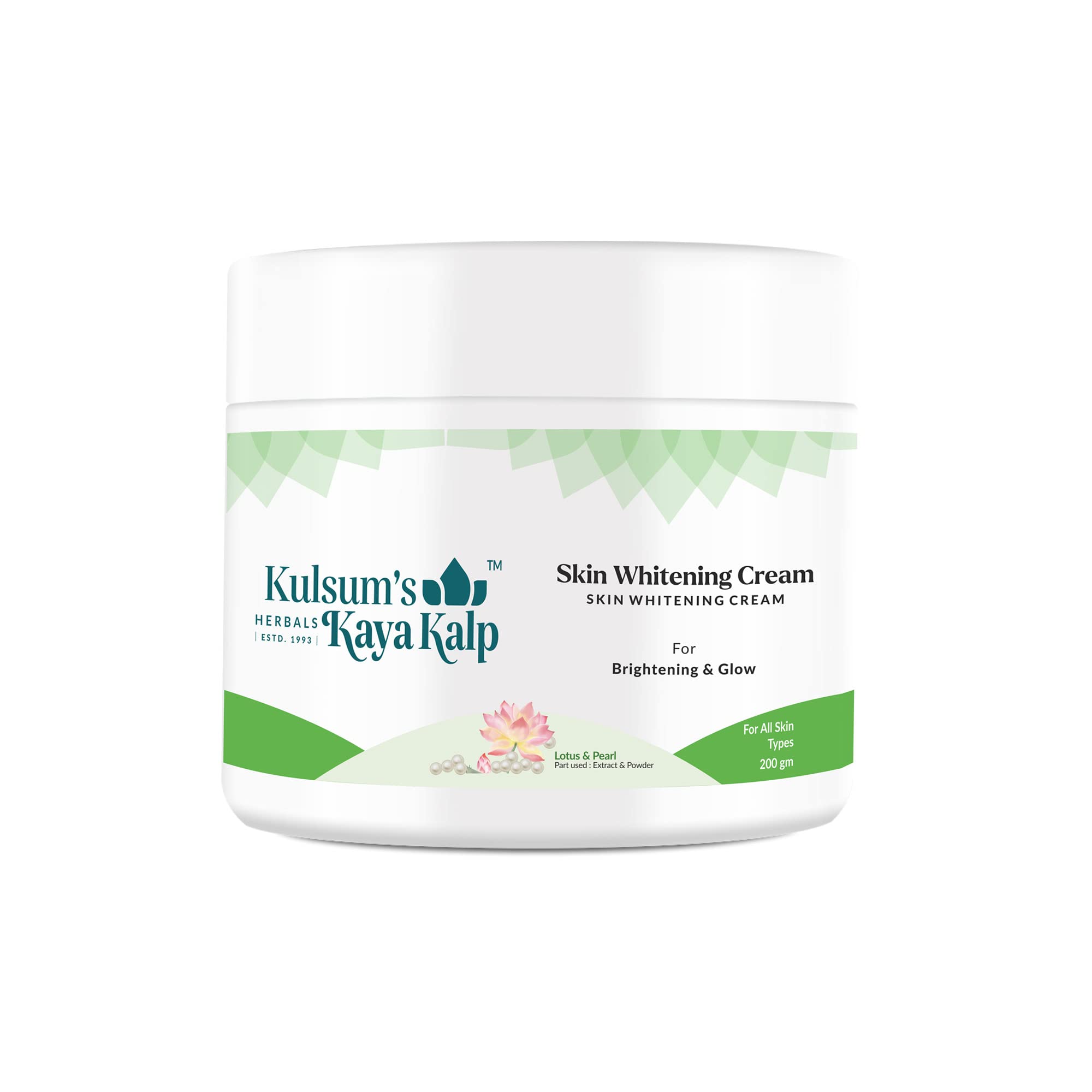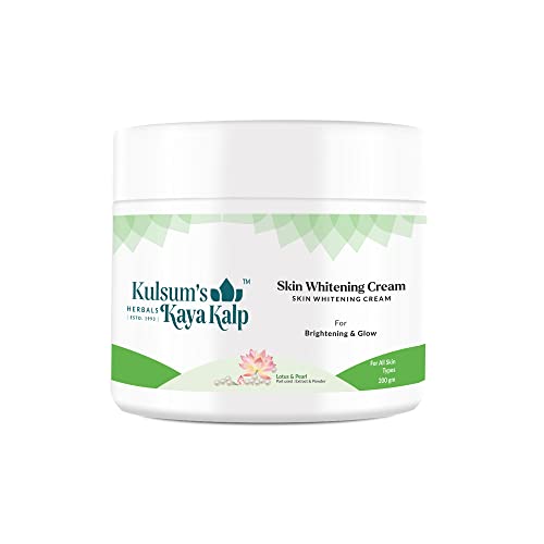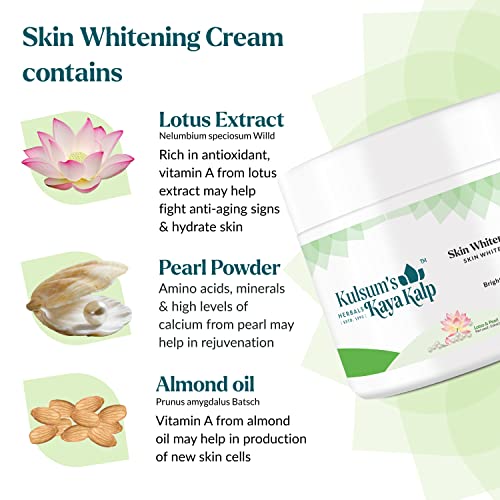 Kulsum's Kaya Kalp Herbals Skin Whitening Cream is packed with pearl powder lotus extract almond oil aloe vera and wheat germ oil. It includes amino acids & flavonoids from pearl powder & lotus extract for hydration and cell repair which results in a glowing even-toned brighter & hydrated face. Get a pearl-like shine with pearl powder in this face cream. Skin creams made with pearl powder are said to stimulate collagen production and protect against free radicals. Lotus extracts contain skin-balancing effects and help with sebum production in the body. Almond oil promotes even skin tone helps minimize puffiness and nourishes the skin. Both aloe vera and wheat germ oil are great for skin. Wheat germ oil promotes even skin tone and protects from oxidative damage. Aloe vera is great for moisturising the skin. Aloe vera has vitamin C E & beta-carotene all of which contribute in providing a youthful radiance to the skin. It further unclogs the pores and softens the skin.