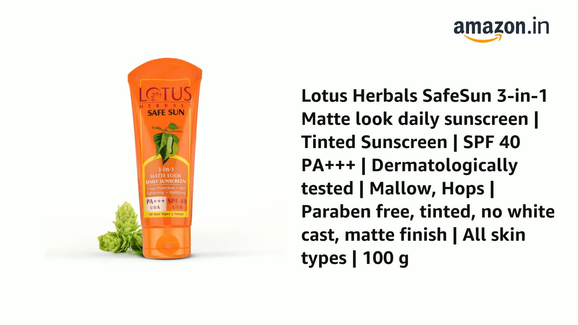 Product Description 3-in-1 daily sun blockIt is a revolutionary sun protection formulation which combines broad-spectrum UVA and UVB protection with skin lightening ingredients to give a uniform matte finish to the skin. Its fast absorption and non-greasy formula ensures a shine-free light and clean feel. Stay Protected from the SunProtect your skin from the harmful rays of the sun with the Lotus Herbals Safe Sun 3-in-1 Matte Look Daily Sunblock SPF 40 100 g. Suitable for all skin types this sunscreen is must have for every woman. The birch extract of this Lotus 3 in 1 matte sunscreen refines the pores of your skin and reduces oiliness. With mallow and hops extracts this sunscreen has a soothing and firming effect on your skin. Whether you are heading out to the beach or travelling to work the Lotus matte-look sunblock SPF-40 will let you breeze through your day without working about skin darkening. Non-Greasy Formula that Gives a Unique Matte FinishFeaturing a non-greasy formula the Lotus sunblock SPF 40 will not look oily on your face. It easily blends into your skin to give you a unique matte finish. Combining UVA and UVB properties with skin lightning ingredients this sunscreen not only protects your skin but also lightens it. Apply this Lotus matte sunscreen SPF 40 on to your face before stepping out of your house to stay protected from harmful UV rays. For best results apply the sunscreen at least 20 minutes before going out in the sun. • Contains birch mallow and hops extract• Non-greasy formula reduces oiliness & refines pores• SPF 40 protects skin from the harmful UVA / UVB sunrays• Get a unique matte finish From the Manufacturer Stay Protected from the SunProtect your skin from the harmful rays of the sun with the Lotus Herbals Safe Sun 3-in-1 Matte Look Daily Sunblock SPF 40 100 g. Suitable for all skin types this sunscreen is must have for every woman. The birch extract of this Lotus 3 in 1 matte sunscreen refines the pores of your skin and reduces oiliness. With mallow and hops extracts this sunscreen has a soothing and firming effect on your skin. Whether you are heading out to the beach or travelling to work the Lotus matte-look sunblock SPF-40 will let you breeze through your day without working about skin darkening.Non-Greasy Formula that Gives a Unique Matte FinishFeaturing a non-greasy formula the Lotus sunblock SPF 40 will not look oily on your face. It easily blends into your skin to give you a unique matte finish. Combining UVA and UVB properties with skin lightning ingredients this sunscreen not only protects your skin but also lightens it. Apply this Lotus matte sunscreen SPF 40 on to your face before stepping out of your house to stay protected from harmful UV rays. For best results apply the sunscreen at least 20 minutes before going out in the sun.Brand: Lotus HerbalsCollection: Safe SunContains birch mallow and hops extractNon-greasy formula reduces oiliness & refines poresSPF 40 protects skin from the harmful UVA / UVB sunraysGet a unique matte finish