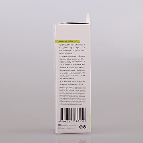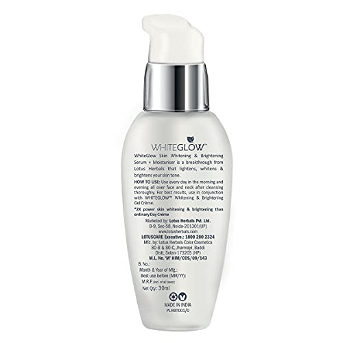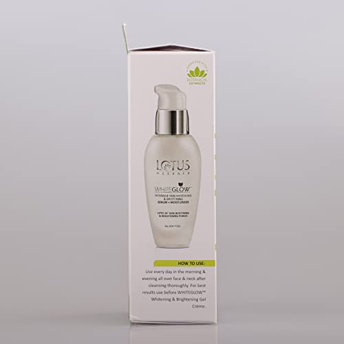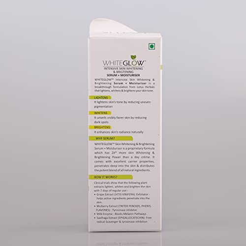 The 2 in1 advantage of Serum + MoisturiserTired of layering your face with one product after another? This product is your dream comes true! The WhiteGlow Intensive Skin Whitening &Brightening Serum gives you the dual benefit of brightening & whitening your skin tone as a serum and delivering nourishing care as a moisturizer.The WhiteGlow SecretThe breakthrough WhiteGlow Skin Whitening & Brightening formula is designed to have a triple action on your skin Lightening Brightening & Whitening.Grape ExtractsGrape extracts contain bio-flavonoids which are extremely powerful anti-oxidants that protect skin from damage and signs of premature ageing and reduce appearance of fine lines & wrinklesMulberry ExtractsMulberries are rich in Anthocyanins which prevent skin ageing leaving you with youthful wrinkle-free skin! It also promotes synthesis of melanin which results in a blemish-free brighter complexion.Milk EnzymesMilk enzymes used in the formulation of this serum plus moistiuriser nourish and moisturize your skin. Whitening and brightening properties of skin enzymes even out your skin tone and add a natural radianceBenefits of Lotus Herbals WhiteGlow Skin Whitening & Brightening Serum + MoisturiserThe most obvious benefits of investing in this serum plus moisturizer are:Brighter Whiter Complexion.Regular use of this serum plus moisturizer reduces the appearance of dark spots and makes your skin look brighter whiter and more radiant.Prevents premature ageing of skin.Enriched with antioxidants which fight free radicals this moisturizer prevents skin ageing and reduces appearance of fine lines and wrinkles making your skin look younger. Ideal For Men & Women