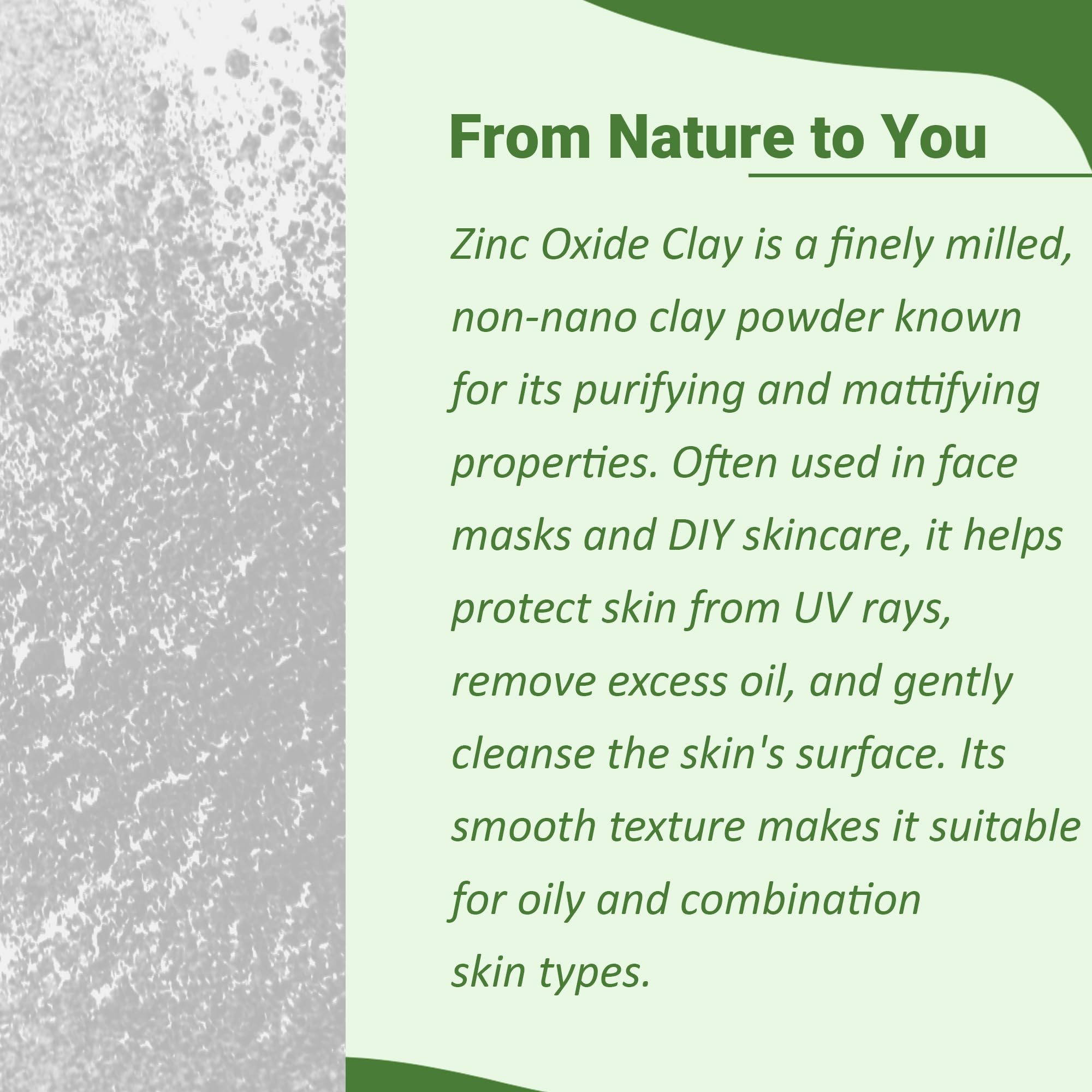 Mi Nature Zinc Oxide Powder 227g (8oz)Mi Nature Zinc Oxide Powder is a high-quality cosmetic-grade ingredient suitable for various DIY skin and hair care applications. Finely milled and pure it is ideal for those who prefer creating their own natural care products with simple clean ingredients.Key Features: Finely milled cosmetic-grade zinc oxide powder Suitable for external use in DIY skincare and hair care recipes Commonly used in oil-balancing formulations Blends well with clays butters and herbal powders Free from additives fillers and synthetic ingredients Comes in a resealable pouch for convenience and freshnessHow to Use:Mix with ingredients such as aloe vera powder rose water clays or carrier oils to create customized face masks lotions balms or hair packs. Always perform a patch test before full application. For external use only.Whether you are a DIY enthusiast or looking for a pure ingredient to enhance your personal care routine Mi Nature Zinc Oxide Powder is a reliable and versatile addition to your daily regimen.