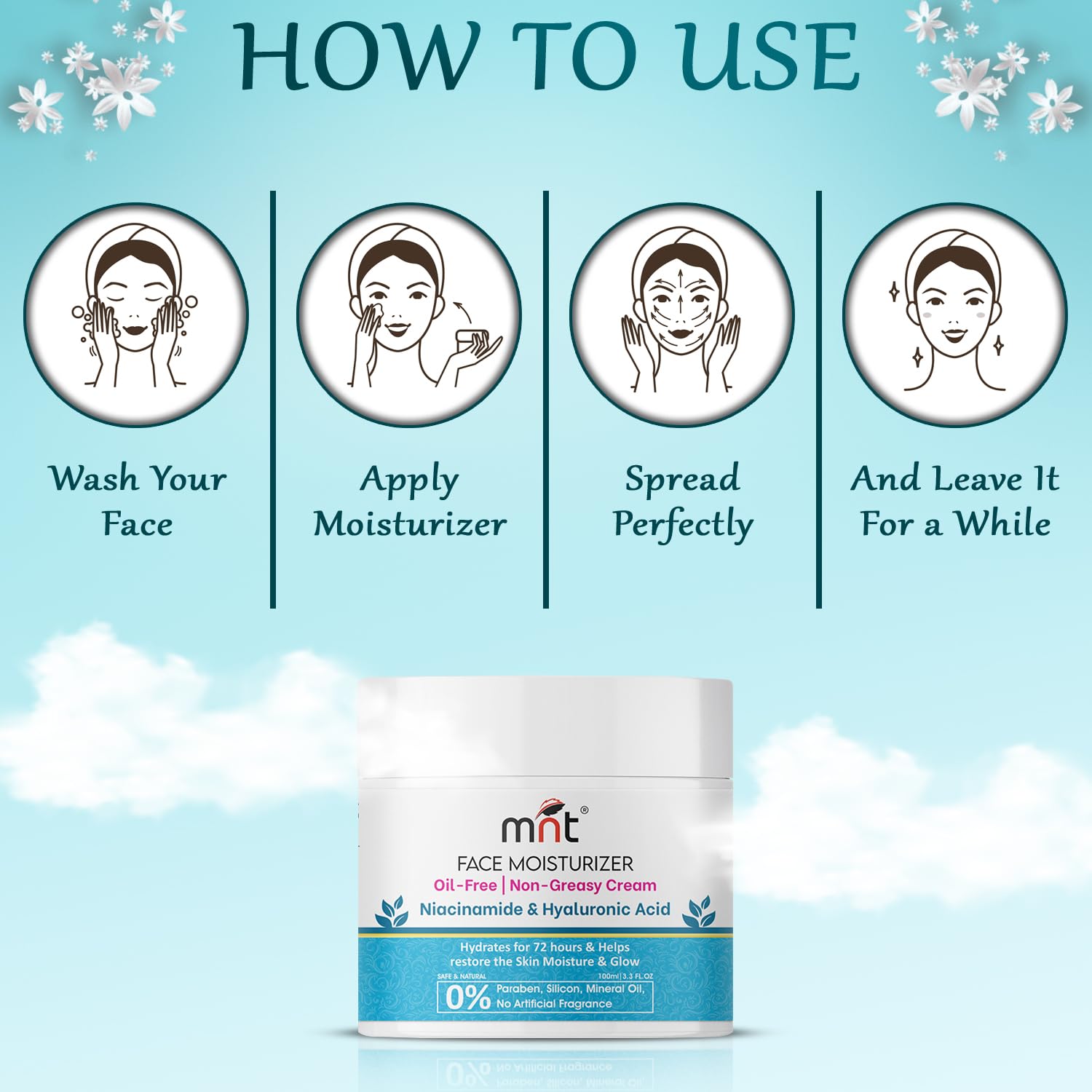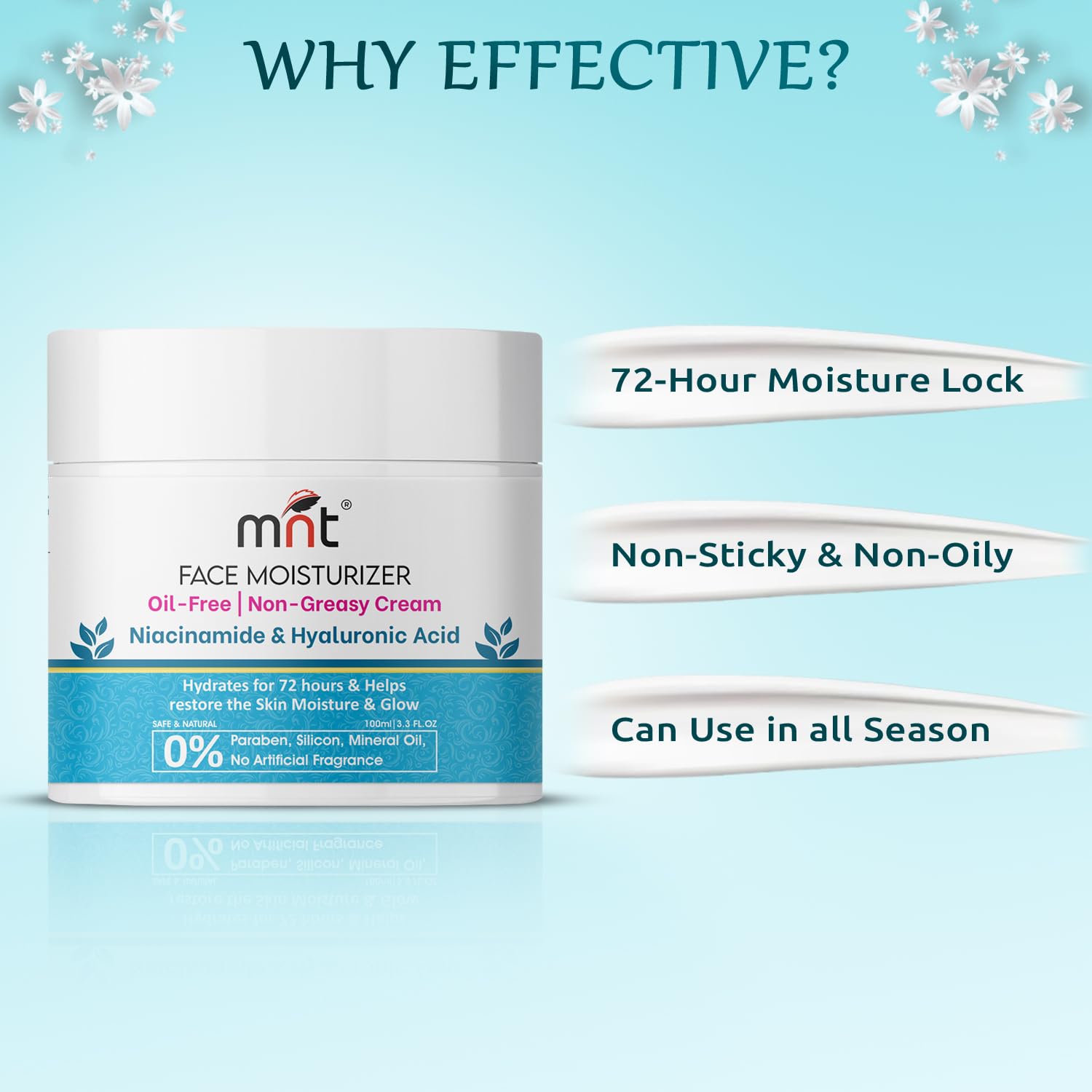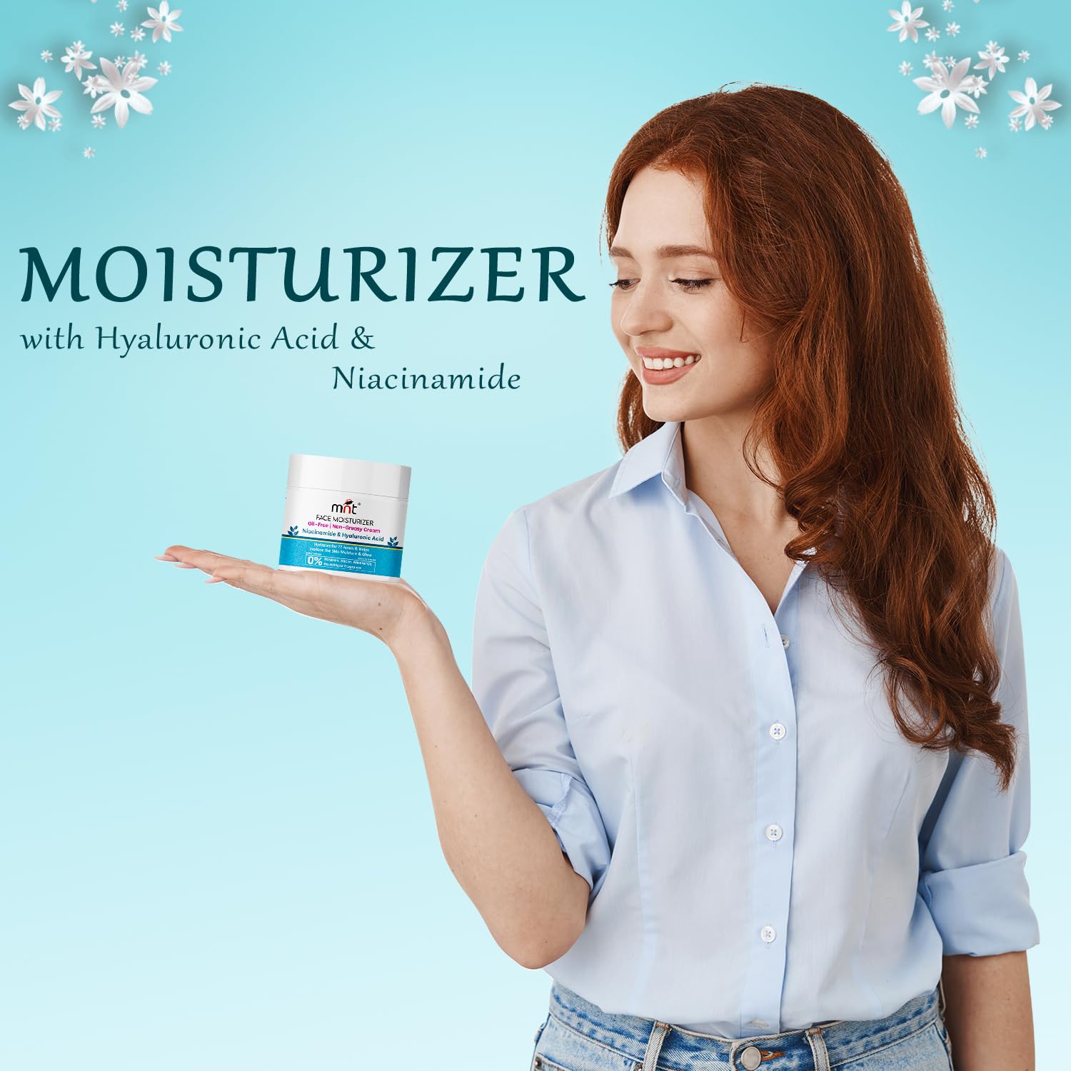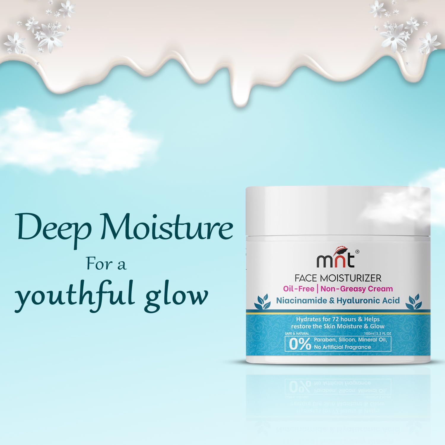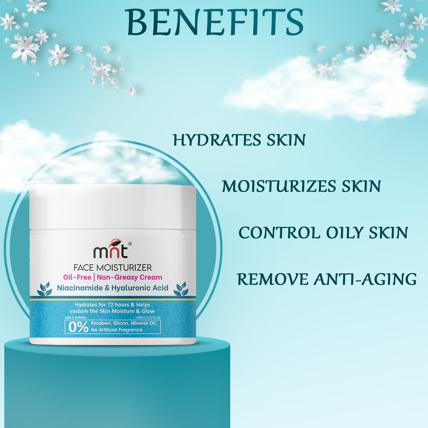 Experience the ultimate in skincare with our MNT Hydrating Face Moisturizer Cream. This advanced formula combines the potent hydrating properties of Hyaluronic Acid with the rejuvenating benefits of Niacinamide. Deeply nourishing and non-greasy this moisturizer effortlessly plumps and hydrates your skin leaving it looking refreshed and youthful. Ideal for all skin types including dry and oil-prone our oil-free formula helps maintain a balanced complexion while addressing common signs of aging like fine lines and uneven tone. With a generous 100 g size this moisturizer offers lasting value ensuring your skin stays radiant and beautifully moisturized. Elevate your skincare routine with MNT Hydrating Face Moisturizer Cream.