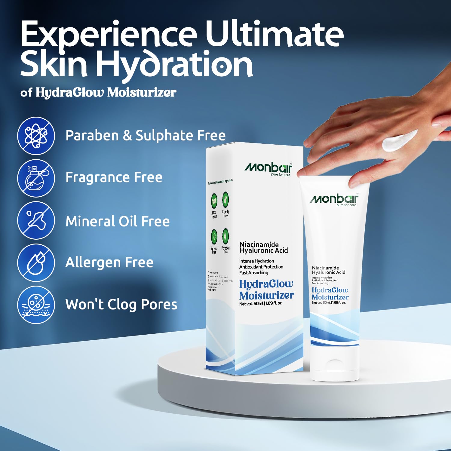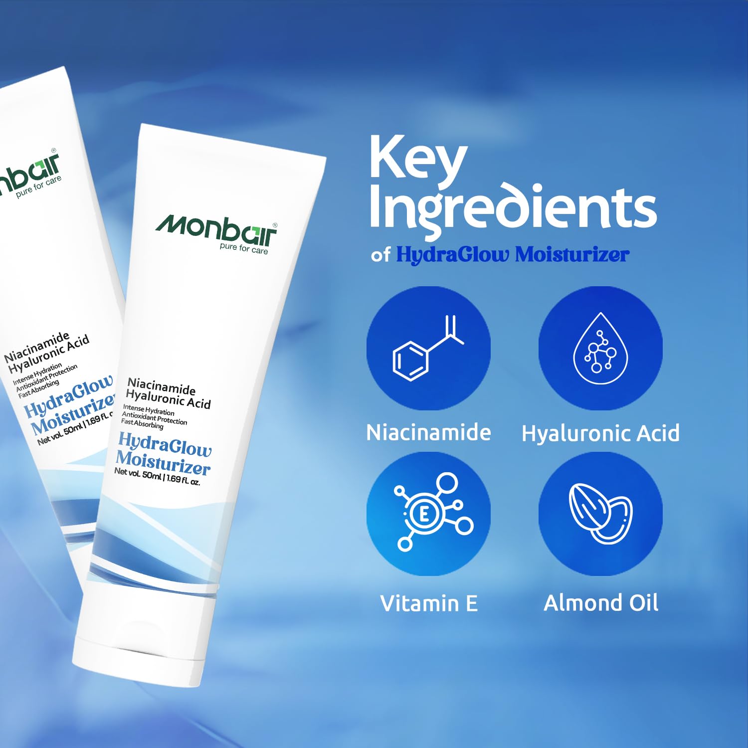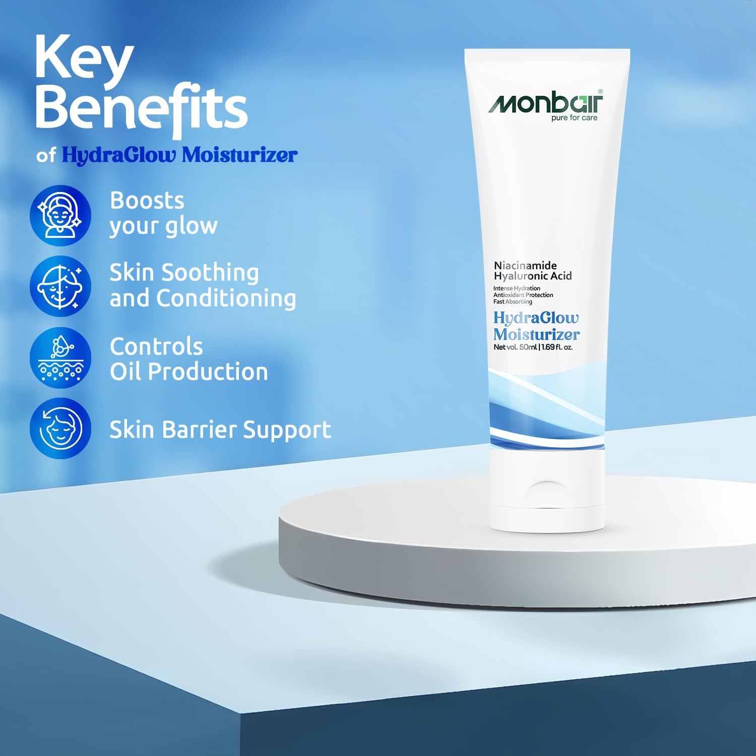 Monbair Hydra Glow Face Moisturizer with Witch Hazel Sweet Almond Oil and Hyaluronic Acid Daily Anti-Aging Moisturizing Cream for All Skin Types 50ml