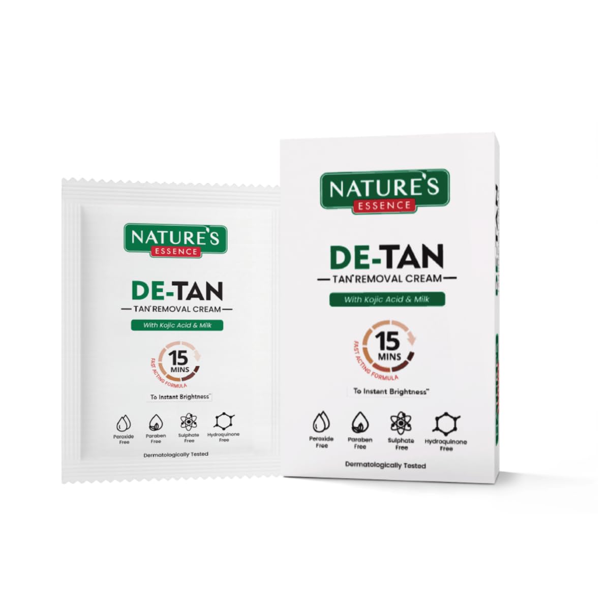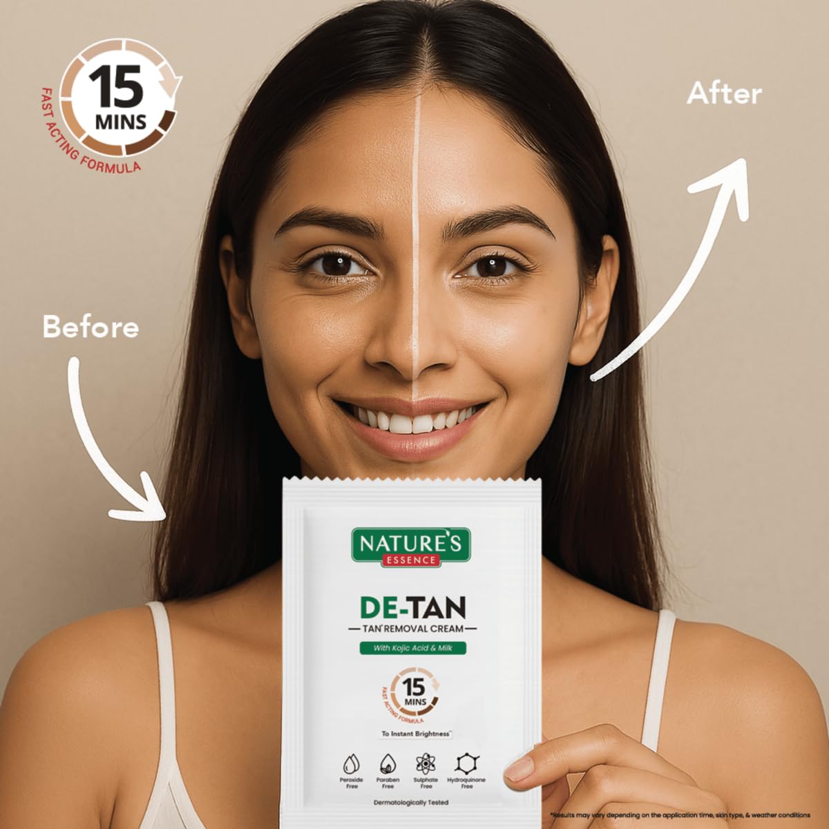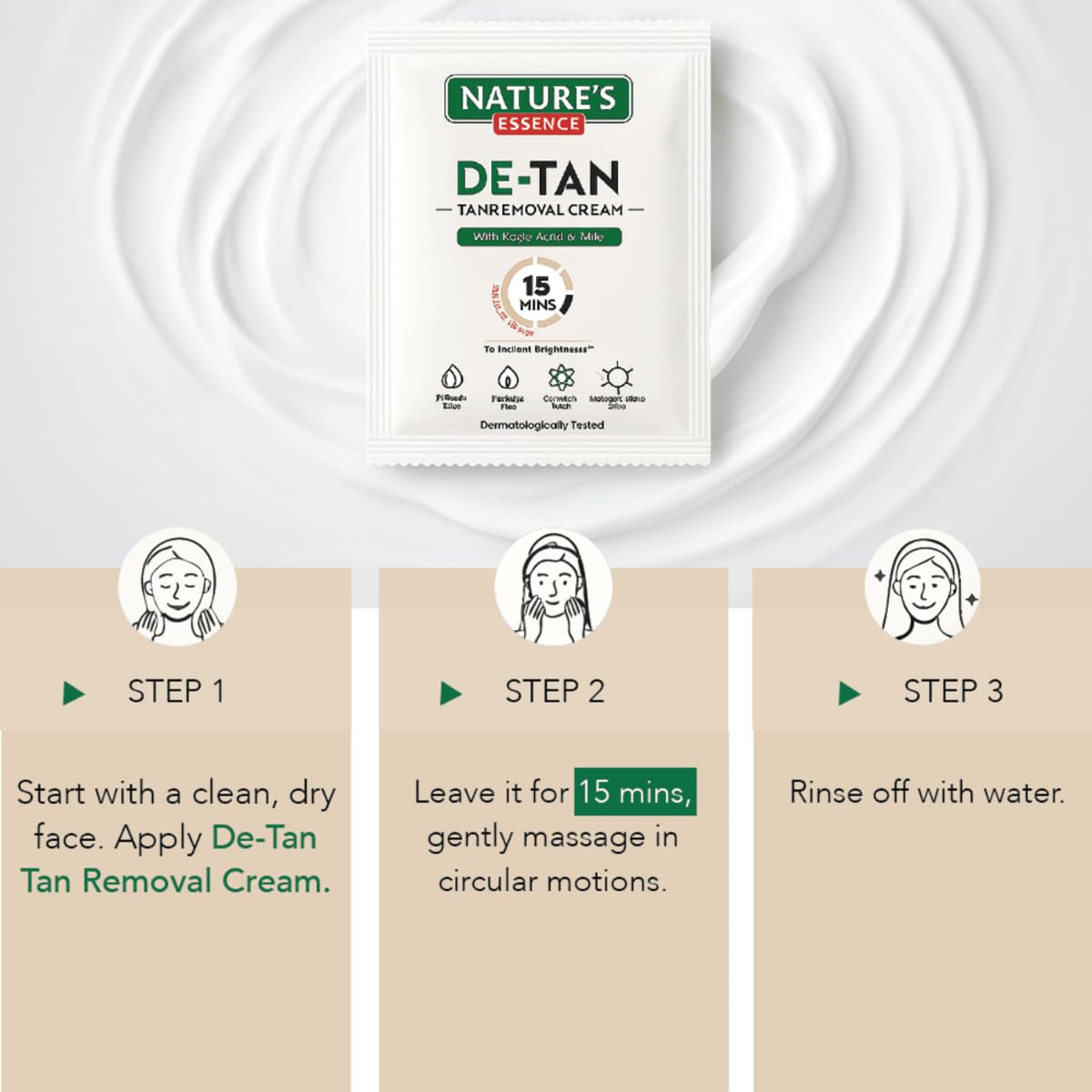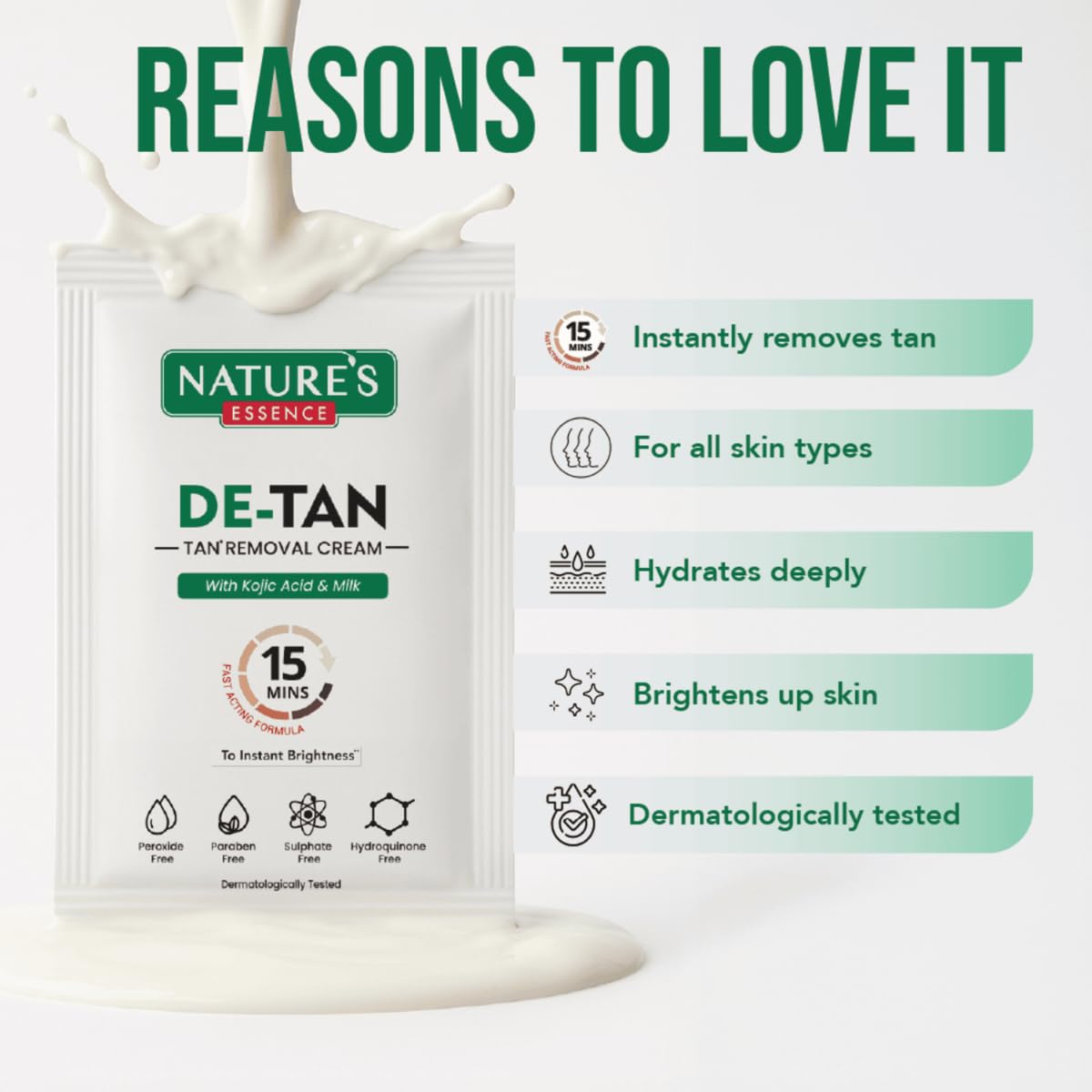 • Tan Removal :- Natures Essence d tan face pack is made with powerful ingredients Kojic Acid reduces tanning dark spots and maintain even skin tone and Milk gently hydrates and exfoliates the skin both together lightens and brihtens your skin"