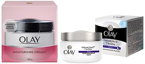 Olay Moisturising Cream 100gYour skin is sure to look more radiant and luminous with Olay Moisturizing Cream that blends well and keeps skin healthy. Long-lasting Moisturization - Get supple skin as this cream reduces dryness and provides long-lasting moisturization. Reduces Fine Lines and Wrinkles - Get firmer skin texture with regular application of this cream that helps to reduce fine lines and wrinkles. Soft and Smooth Skin - Enjoy younger looking skin with this cream from Olay that makes it soft and smooth. Nourishment up to 12 Hours - Providing 12 hours of nourishment this cream keeps your skin hydrated. The composition of the cream is similar to the natural elements present in the skin and hence is both effective and safe. Directions - Apply liberally to cleansed face and neck twice a day. Tips and Advice - Wash your face with a good cleanser before applying skin creams for better results. Warnings - As with all facial skin care products avoid contact with eyes. If contact occurs rinse eyes thoroughly with water. If eye and skin irritation develops discontinue use. Keep out of reach of children. Ingredients - Water Glycerin Mineral Oil Cetyl Alcohol Petrolatum Cyclopentasiloxane Stearyl Alcohol Isopropyl Palmitate Carbomer Dimethicone Sodium Hydroxide PEG-100 Stearate Stearic Acid Fragrance Methylparaben PEG/PPG-20/20 Dimethicone Titanium Dioxide Imidazolidinyl Urea Propylparaben Disodium EDTA Benzyl Benzoate Alpha-Isomethyl Ionone Citronellol Linalool Amyl Cinnamal CI 17200.Olay Night Cream Natural Aura Nourishing Repair Cream50gInternational bestseller Skincare Brand Olay has engineered a range of products that promises the perfect skin for all ages and across skin types. Natural Aura night is designed to deliver nutrients at night for a natural and healthy looking fair skin. It Nourishes skin while sleeping to lightens and brighten the skin tone. Wake up to even skin tone and reduced appearance of dark spots. Visible Skin Results from Day 1. Get your Skin Hydrated smooth & plump. Start with the youthful glow for your skin now with the Olay Range.