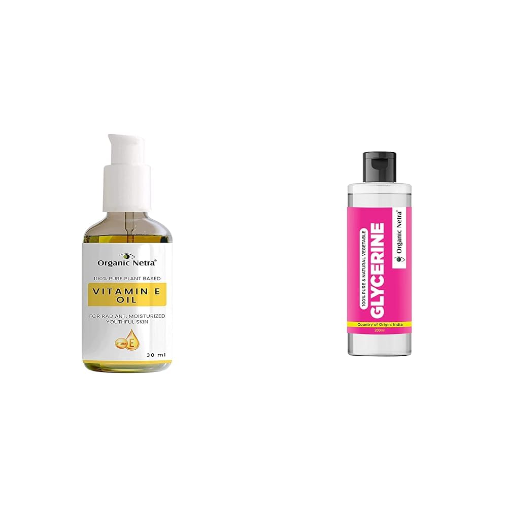 Organic Netra 100% Pure Plant Based Vitamin E Oil For RadiantMoisturized Youthful Skin For Men and Womens Reduces scarsstretch markswrinkles helps in hair growth -30 ml.Organic Netra Vitamin E oil is extracted from pure natural plants and seeds rich in Vitamin E. Natural vitamin E is known to absorb quickly and efficiently by the body than any other synthetic type. Easily absorbed by the skin without that sticky feeling! Our vitamin E is blended and derived from Almond Apricot Avocado Sunflower Wheat Germ Rosehip and Coconut Oils. This vitamin e oil for scars has several skincare benefits. It works as an anti-aging solution to visibly reduce fine lines wrinkles stretch marks and improves skin tone. This is an amazing anti-aging solution that keeps your skin supple and hydrated. Removes circles and dark spots around the eyes. Use it as a make-up remover as a facial toner or even as a body oil as it works its magic on your skin!Organic Netra Glycerine for Face |100% Pure & Natural Glycerine Liquid for Face Beauty and Skin Care | Pure & Unscented Glycerine | Suitable for All Skin Type - 200ml (Pack of 1)Organic Netra vegetable glycerine is made using Organic Vegetable Oils and other high-grade ingredients to give you an odorless and mildly sweet syrup that will moisturize your skin without any side effects. This organic liquid also promotes skin health and acts as a barrier to safeguard your skin from the elements including wind and cold. It cleanses your skin facilitates the regeneration of new skin evens out the skin tone and guards against the harmful effects of UV radiation.