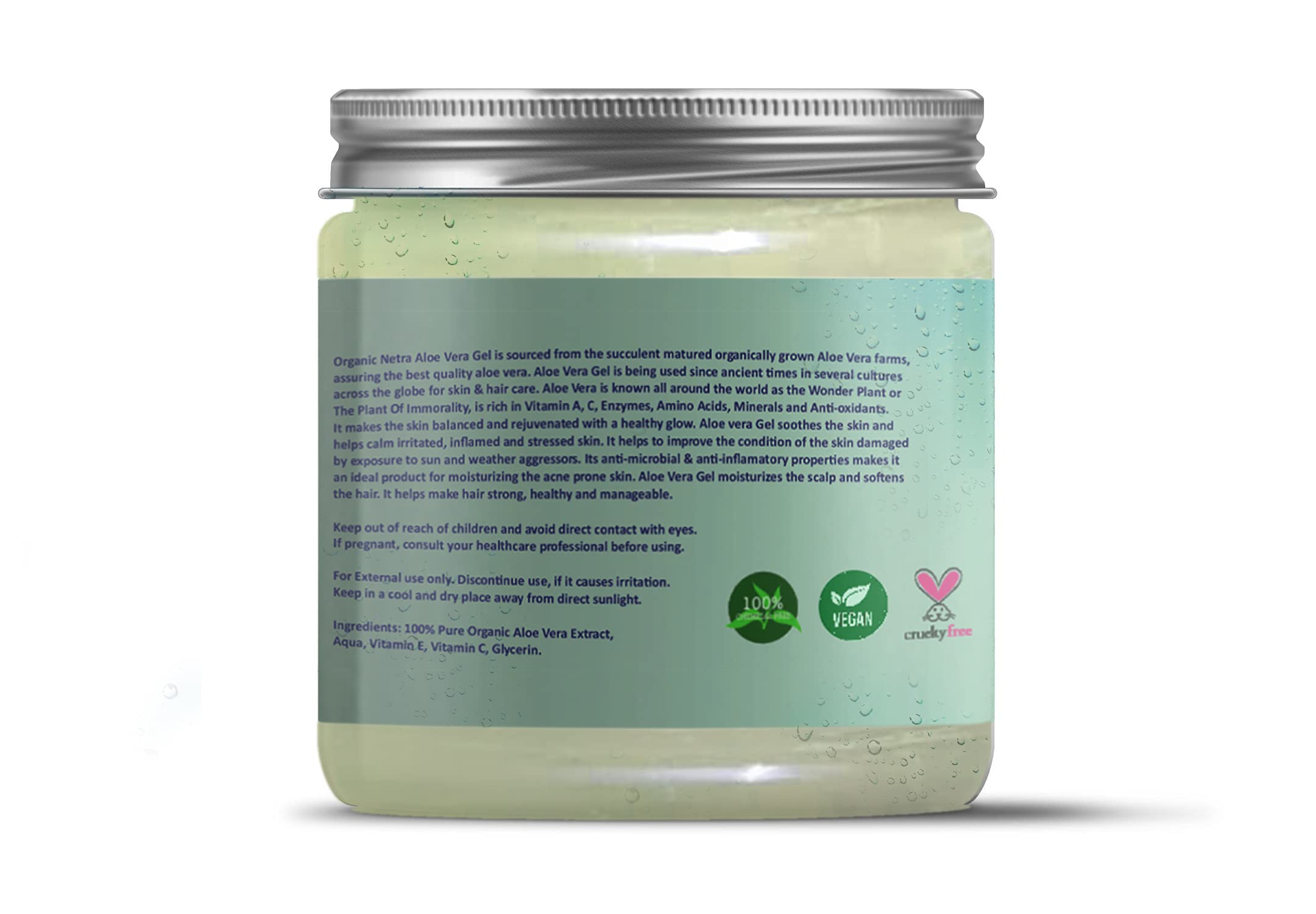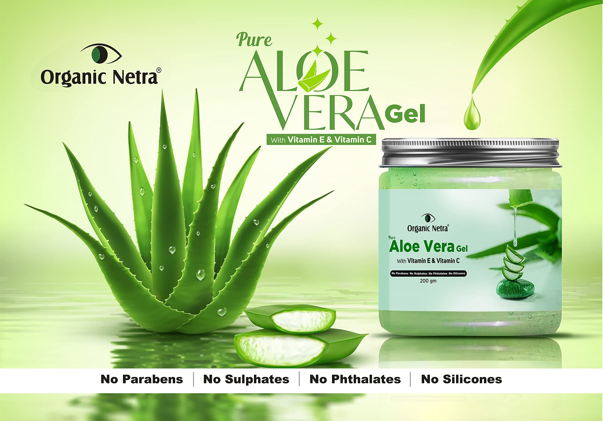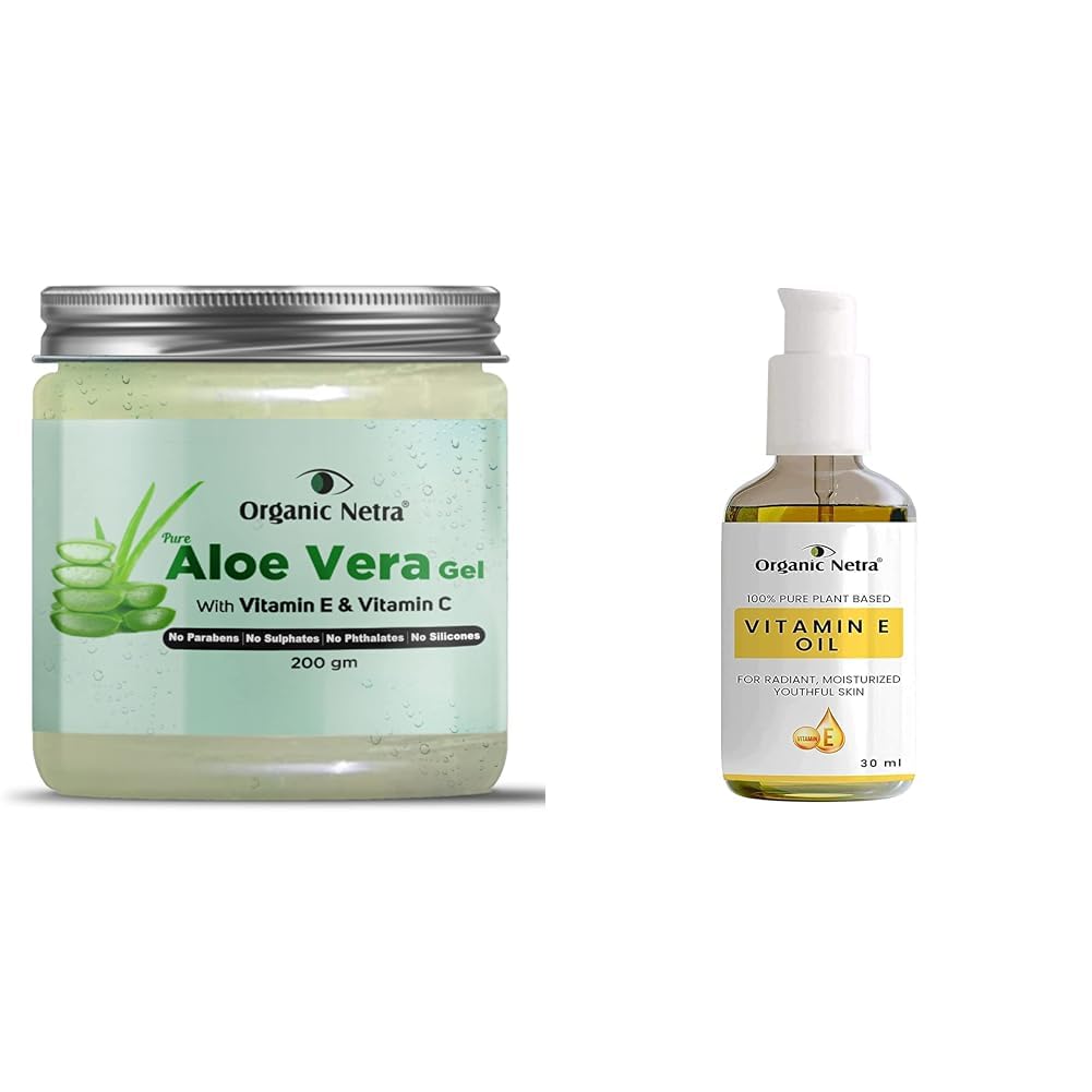 Organic Netra Pure Aloe Vera Gel with Vitamin C & E for Skin Face and Hair | Helps to Repair and Smoothens Hair | Relax and Renew your Skin and Scalp |Paraben Free & Sulphate Free - 200 GmOrganic Netra Aloe Vera Gel is sourced from the succulent natural originally grown aloe vera plant and ensures super high quality aloe vera gel with 0% Paraben 0% Silicone Hexane-free Non-GMO No Sulfates No Phthalates No Mineral Oils and extracted by cold-pressed technology make this the best aloe vera gel for skin and hair and Enriched with Vitamins C & E. Natural Aloe Vera Gel leaves your skin smooth silky and hydrated.Organic Netra 100% Pure Plant Based Vitamin E Oil For RadiantMoisturized Youthful Skin For Men and Womens Reduces scarsstretch markswrinkles helps in hair growth -30 ml.Organic Netra Vitamin E oil is extracted from pure natural plants and seeds rich in Vitamin E. Natural vitamin E is known to absorb quickly and efficiently by the body than any other synthetic type. Easily absorbed by the skin without that sticky feeling! Our vitamin E is blended and derived from Almond Apricot Avocado Sunflower Wheat Germ Rosehip and Coconut Oils. This vitamin e oil for scars has several skincare benefits. It works as an anti-aging solution to visibly reduce fine lines wrinkles stretch marks and improves skin tone. This is an amazing anti-aging solution that keeps your skin supple and hydrated. Removes circles and dark spots around the eyes. Use it as a make-up remover as a facial toner or even as a body oil as it works its magic on your skin!