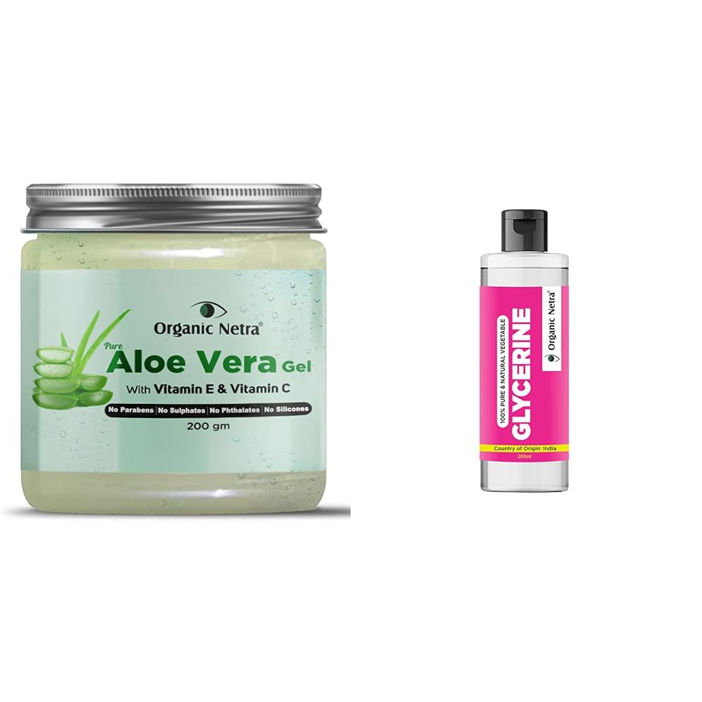 Organic Netra Pure Aloe Vera Gel with Vitamin C & E for Skin Face and Hair | Helps to Repair and Smoothens Hair | Relax and Renew your Skin and Scalp |Paraben Free & Sulphate Free - 200 GmOrganic Netra Aloe Vera Gel is sourced from the succulent natural originally grown aloe vera plant and ensures super high quality aloe vera gel with 0% Paraben 0% Silicone Hexane-free Non-GMO No Sulfates No Phthalates No Mineral Oils and extracted by cold-pressed technology make this the best aloe vera gel for skin and hair and Enriched with Vitamins C & E. Natural Aloe Vera Gel leaves your skin smooth silky and hydrated.Organic Netra Glycerine for Face |100% Pure & Natural Glycerine Liquid for Face Beauty and Skin Care | Pure & Unscented Glycerine | Suitable for All Skin Type - 200ml (Pack of 1)Organic Netra vegetable glycerine is made using Organic Vegetable Oils and other high-grade ingredients to give you an odorless and mildly sweet syrup that will moisturize your skin without any side effects. This organic liquid also promotes skin health and acts as a barrier to safeguard your skin from the elements including wind and cold. It cleanses your skin facilitates the regeneration of new skin evens out the skin tone and guards against the harmful effects of UV radiation.
