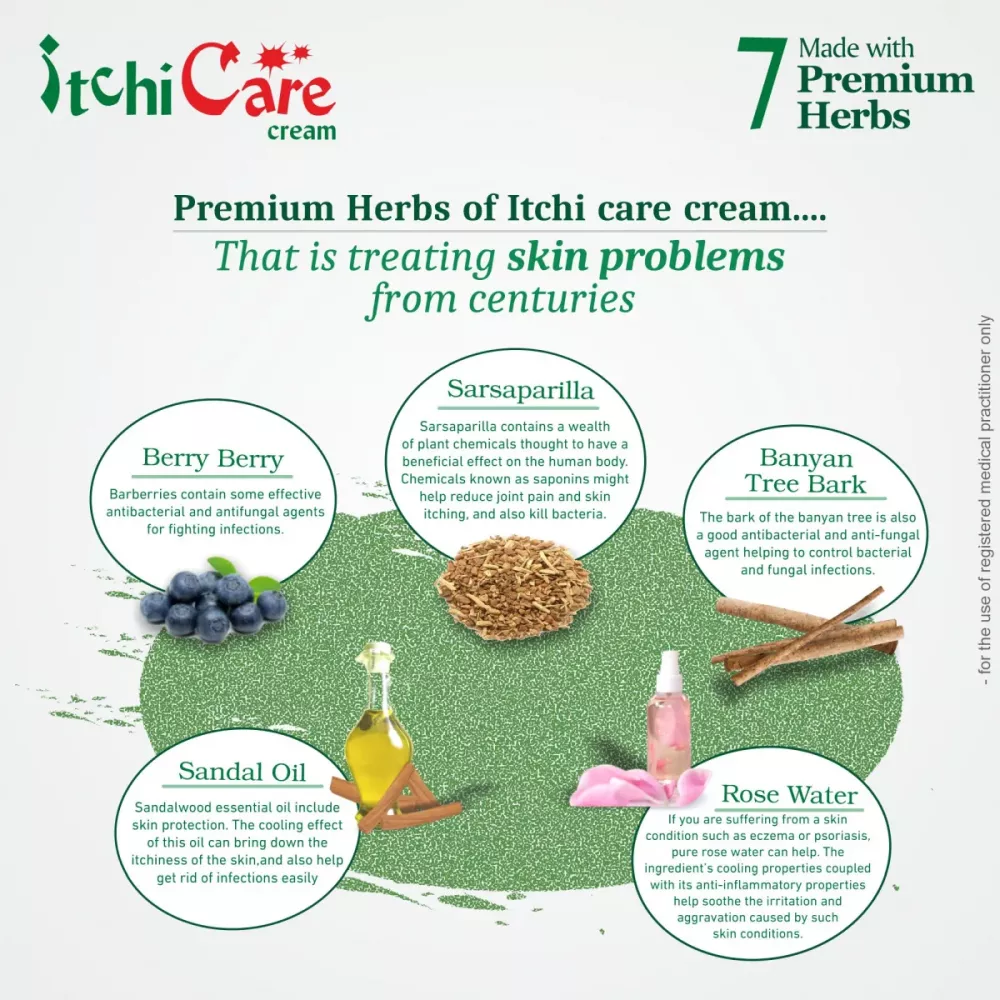 Itchi care Cream for Fungal infection, Dry & wet eczema is unique combination of 8 herbs like Tankan, Sandal Oil, Banyan Tree, Gulab Phool, Milk powder and many more. The special ingredients of Itchicare cream provide relief from itching, Heinz, Scabies, inflammation, Psoriasis & ringworm.