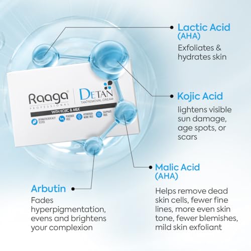 Raaga Professional De Tan Cream brings you the power of nature. Its unique formulation contains scientifically extracted actives of fruits and Kojic acid Milk & Honey help to remove the skin tan due to over exposure to sun. The Kojic acid present in the products helps to inhibit the melanin formation and lightens the skin tone on regular usage. Pure Milk & Honey help moisturizes and hydrates your skin. Raaga Professional De-tan cream is a Skin-lightening product. This is a unique tan removing formula that lightens skin tone removing tanning effect of the sun. This product is unique in that it doesn't have any kind of colour lifting effect on facial hair like the normally used skin bleach.