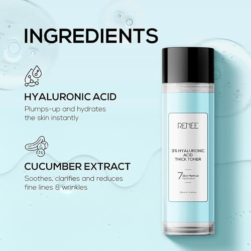Presenting RENEE Hyaluronic Acid Thick Toner for intense hydration. Infused with 3% Hyaluronic Acid this toner simplifies the Korean 7 skin method to get glassy skin in a single step! This formula reduces fine lines encourages cell renewal and leaves your skin looking dewy luminous and effortlessly radiant.