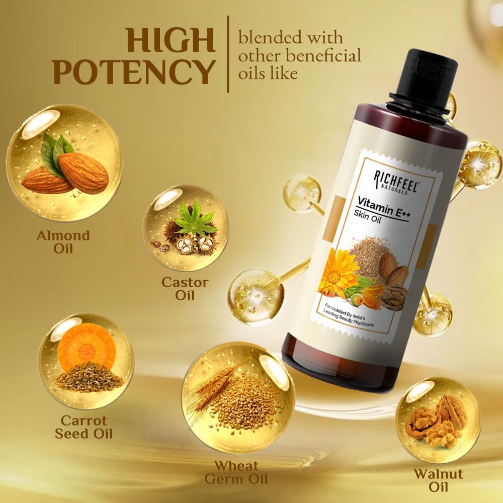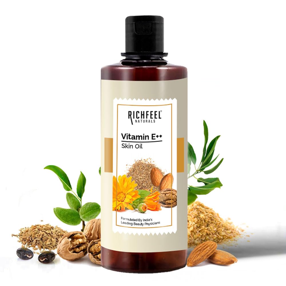 Richfeel Vitamin E ++ Skin Oil is designed to provide essential nourishment to the skin. Vitamin E is a key ingredient known for its antioxidant properties which can help protect the skin from free radical damage and promote overall skin health. This skin oil is typically used to moisturize and revitalize the skin. âRichfeel Vitamin E Skin Oil is a physician-formulated blend of Almond Wheat Germ Walnut and Carrot Seed oils enriched with Vitamin E to provide comprehensive skincare benefits. Packaged in a 500 ml bottle this oil is designed to address various skin concerns.â