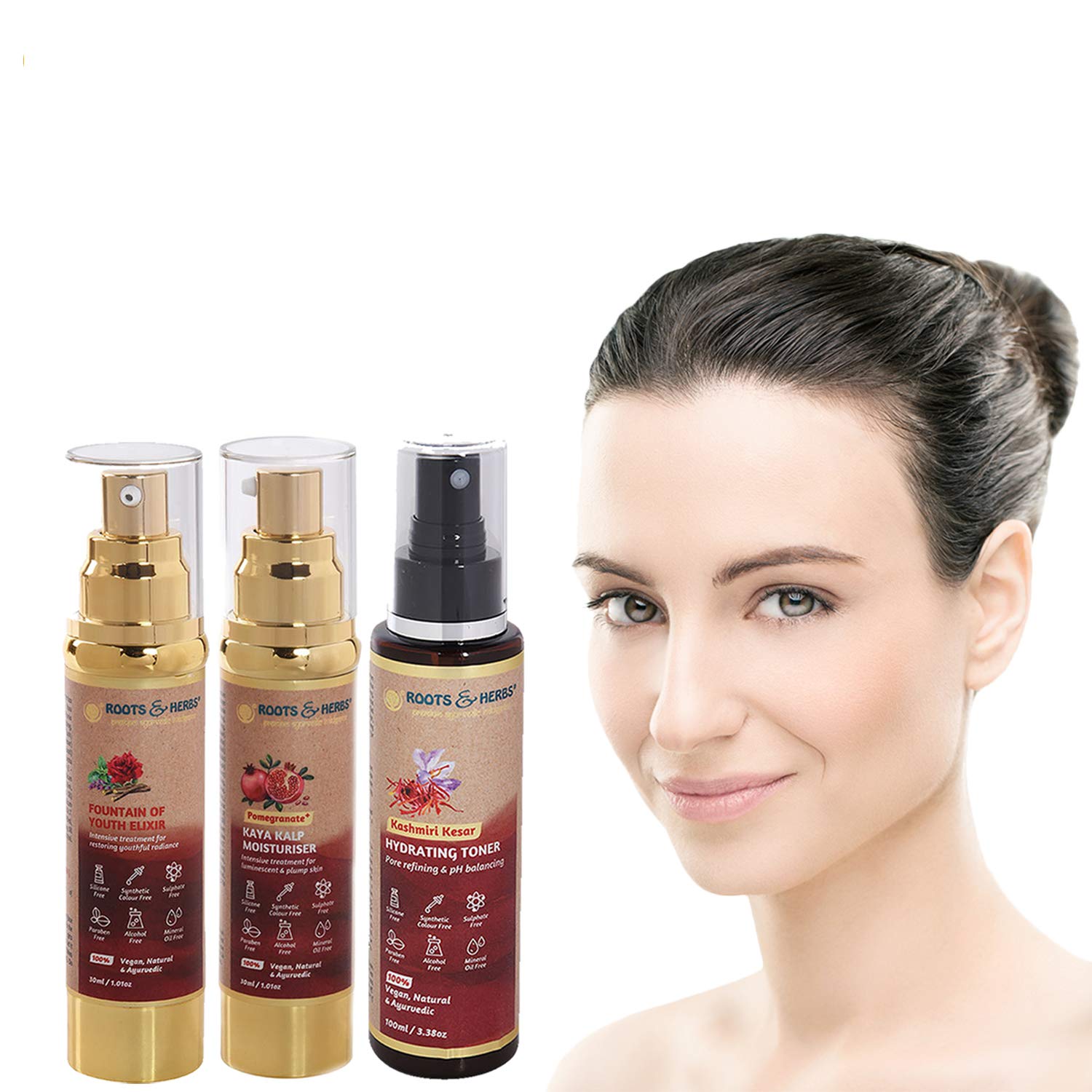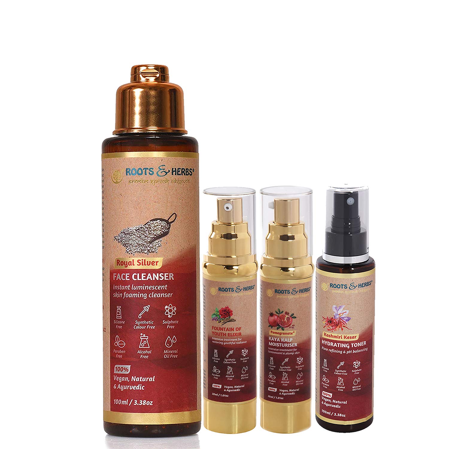Our busy lives do not give us enough time to maintain a proper skin during the day and hence this results in piling up of several skin issues. Add our unhealthy lifestyles to it which ruins our skin all the more. To give you a respite from your daily conundrum Roots & Herbs has come up with a Night Care Combo that helps you treat your skin in the peace of night. Roots & Herbs Face Care Combo includes Royal Face Wash that helps in minimizes fine lines hydrates and improves the skin textureRoots & Herbs Kashmiri Kesar Toner that helps to hydrate revive tone and restore the skin's ph levels and last but not the least POMEGRANATE MOISTURISER / FOUNTAIN OF YOUTH (ANTI-AGEING) that is an ideal moisturizer for keeping your skin soft supple and adequately moisturized. Follow this night care regime daily to get a clear and healthy skin each passing day with a regular use.