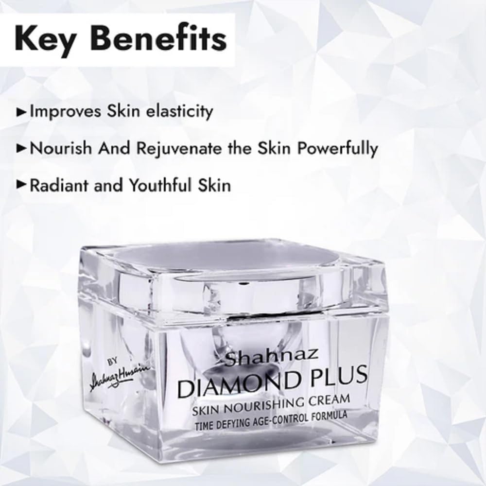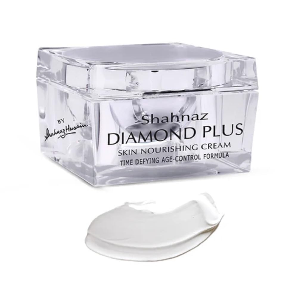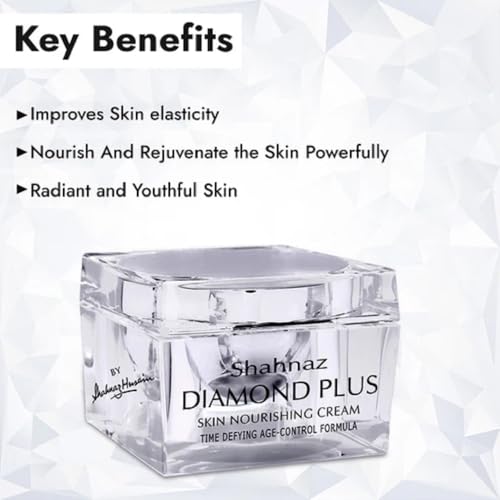 Shahnaz HusainâS Diamond Plus Skin Nourishing Cream Is The Ultimate In Skin Nourishment. The Formulation Is Specially Enhanced By Advanced Techniques. Ash Of Diamond Has Been Reinforced With Organic Extracts Of Vetiver Date Shea Butter Tomato Olive Oil And Vitamin-E To Nourish And Rejuvenate The Skin Powerfully. It Helps To Strengthen The Supportive Tissues Improving Skin Elasticity And Making The Skin Firm And Supple. Leaves The Skin Clear Radiant And Youthful. A unique preparation specially formulated to preserve the youthful qualities of the skin. The extracts of Vetiver and Date along with ashes of Diamond and Tankana helps to purify the skin and remove toxins improving cell regeneration. Revitalizes and rejuvenates the skin delaying the manifestation of ageing signs.