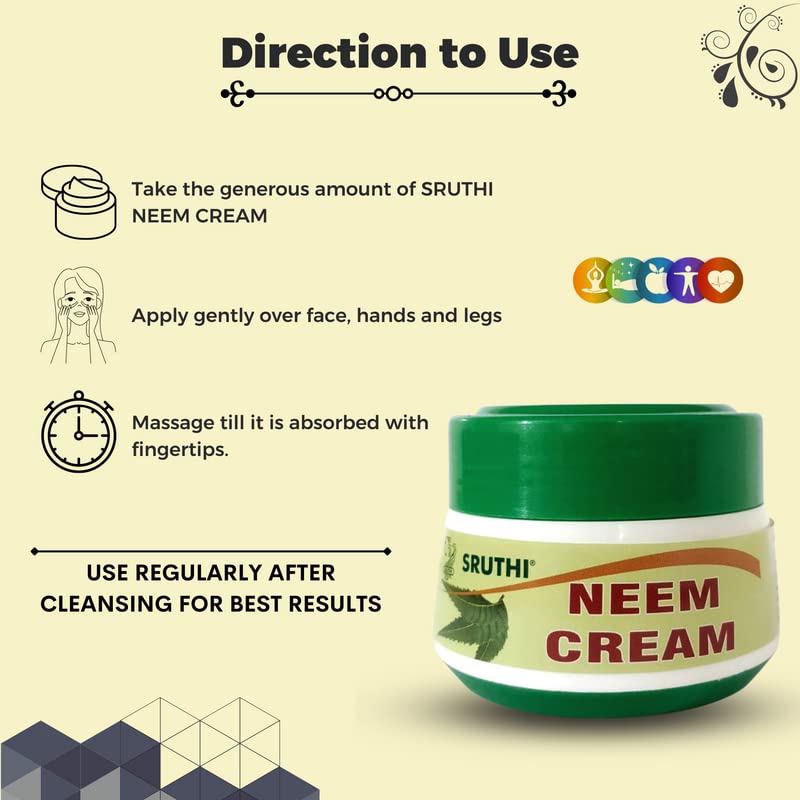 Direction to use: Apply Sruthi Neem Cream gently over face neck hands and legs daily after cleansing. For best results use daily.