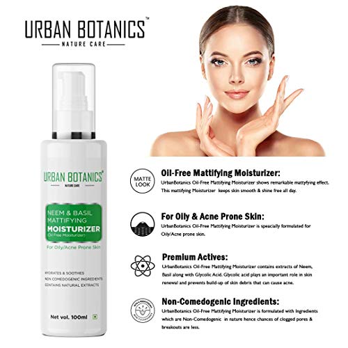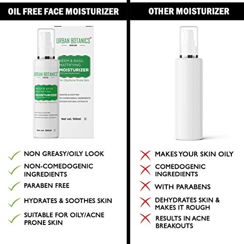 UrbanBotanics® Oil Free Moisturizer For Face - Mattifying Moisturiser Face Cream for Oily/Acne Prone/Normal Skin - with Neem & Basil Extract, Face Moisturizer For Women & men - 100ml