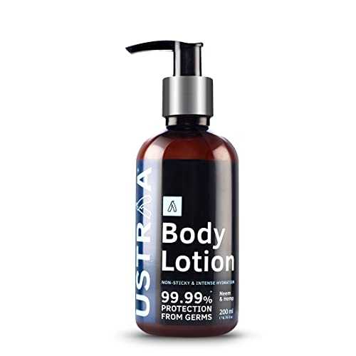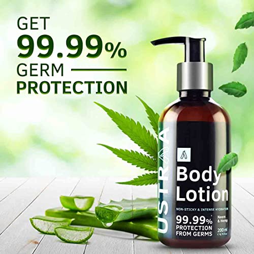 Ustraa Body Lotion Germ-Free - 200ml | Fights Dry Skin and Germs | Non-Sticky, Moisturizes & Hydrates Skin | With Hemp, Vitamin E, Aloe vera, and Neem.