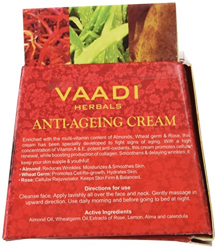 Enriched with the multi vitamin content of almonds wheat germ and rose this cream has been specially developed to fight signs of aging. With a high concentration of vitamin A and E potent anti oxidants this cream promotes cellular renewal while boosting production of collagen. Smoothing and delaying wrinkles its keep your skin supple and youthful. One cannot defy time or the aging process. Over the time the skin is bound to age. But if skin care is given an utmost importance one can age with poise. Vaadi Herbals' Anti-Wrinkle Cream is packed with Almond Oil Wheat germ Oil and Manjistha all three of which together form the perfect Age-with-Grace formula. Regular application of the Anti-Wrinkle Cream reduces fine lines tightens the skin boosts the regeneration of cells and provides the necessary hydration to the skin making it younger smoother and softer. How does Wheat germ Oil fight wrinkles and age? Wheat germ Oil is obtained in unrefined form from the core (or kernel) of wheat grain. In comparison with any vegetable oil Wheat germ Oil contains the maximum percentage of Vitamin E. Apart from gifting the skin a supple glow it is known to treat dry patches by maintaining the natural moisture balance. It is effective on all skin types. The presence of Vitamin E makes Wheat germ Oil a very powerful antioxidant which fights wrinkles and fine lines. On a regular application premature aging stops and a younger-looking even toned skin is visible. Dark spots under-eye circles and pigmentation are effectively cured by Wheat germ Oil. It soothes the skin and works on cell renewal and fighting wrinkles. Wheat germ Oil works effectively by penetrating deep into the layers of the skin and providing moisture to the skin cells which in turn increases skin elasticity. Collagen production is significantly boosted by regular use of Wheat germ Oil. Wrinkles fade away in no time and the aging process definitely hits a halt. How does Manjistha help in skin rejuvenation? Rubia cordifolia or Manjistha is a very effective herb that helps in improving skin complexion as it percolates down the skin and improves in circulation of blood. Also Manjistha fights skin disorders like pigmentation black spots and scars irregular tanning leading to discoloration and sun burns. Manjistha brings back the glow and youthful sheen that diminishes due to aging of the skin. By promoting a faster healing of the skin Manjistha acts both as a shield as well as a nourishment provider to the skin. Pimples freckles wrinkles and fine lines are effectively dealt with by this powerful herb. Manjistha improves skin's texture and elasticity. The aging process slows down due to better blood flow and skin is radiant squeaky clean and full of life.How does Almond Oil nourish the Skin? Sweet almonds' or Prunus dulcis dry kernel yields almond oil. A light-weighted oil Almond Oil is an effective emollient that soothes the skin and relieves skin irritation and itchiness. Almond Oil penetrates deep in the skin's layers and provides moisture and nutrients to the skin to make it healthier smoother and glowing with life.Being rich in Vitamin E regular application of Almond Oil fades away wrinkles fine lines and dry patches. Also the aging process slows down. On the surface Almond Oil acts as a shield from sun pollution and skin-aging factors and on the inside it hydrates the skin cells boosting cell growth and suppleness.