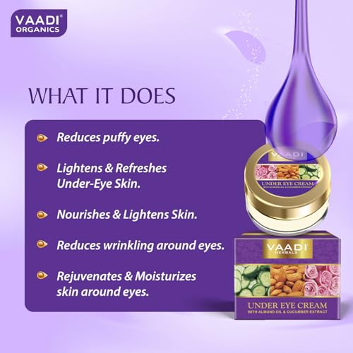 A super rich formula for your under eye skin its regular use keeps your eyes and the surrounding skin looking young and lively. The age old goodness of cucumber almonds and pink rose works from within to lighten the dark skin (circles) under the eyes and to reduce puffiness. Their anti oxidant content smoothes wrinkles reducing years off your eyes.The area under the eyes has the most sensitive skin. It is thin and lacks the oil glands like rest of the skin. This makes it all the more important to nourish it so as to keep dark circles and wrinkles at bay. Lack of sleep constant exposure to the sun long working hours and lack of proper nutrition and care leads to dark circles puffy eyes bags and fine lines called the crow's feet.Further as the skin ages these signs make the face appear stressed unattractive and one tends to look older than their age. An all natural Under Eye Cream will not only cure the above signs but also nourish the skin to make it healthier and resistant to external factors. By revitalizing the sensitive skin under the eyes the cream acts as a gentle moisturizer that seeps in and cools the skin's epidermal layer.How does Almond Oil treat under eye dark circles?Sweet almonds' dry kernel yields almond oil. This light-weighted oil is rich in Vitamin A and D which help in treating sensitive skin with care and safeguard it from damage and allergies. Almond Oil is: Natural Moisturizer: The best thing about this oil is that it suits all skin types. Pure Almond Oil moisturizes the skin under the eyes relieving stress bags. It is a great lubricant that not only soothes the skin but also penetrates in the skin's layers making up for any kind of essential oil loss. This helps in fading away the dark circles in no time. Excellent Emollient: Almond Oil has essential nutrients in it which softens and soothes the skin. Also it compensates for the skin's water loss by replacing it with moisture and nutrients. Improves Skin Complexion: Almond Oil is rich in Vitamin E. It not only improves the skin complexion diminish the appearance of dark circles but the skin looks all the more young healthier. Fine lines and crow's feet disappear and the skin-aging process slows down. It brightens the eye contour.How does Vitamin E prevent wrinkles? Since the human body does not synthesize Vitamin E it has to be supplied externally. Vitamin E is extremely important for: Anti Aging Benefits: Vitamin E is very effective in diminishing fine lines wrinkles and fighting the possible signs of aging thus acting as the perfect anti-aging element. The crow's feet and lines near the eyes disappear with frequent use of the cream. Anti-Oxidant: Vitamin E is considered as the best anti-oxidant. It protects the sensitive skin under the eyes from sun's harmful UV-Rays which may have an harsh impact otherwise. With constant exposure the dark circles further darken and skin ages rapidly. Vitamin E acts as a protective shield beautifying the area around the eyes. The cooling effect of Cucumber Packed with silica Cucumber is a complete under eye treatment in itself. It not only it helps in removing under-eye puffiness but also helps in reducing wrinkles. Cucumber is a natural moisturizer and is a great relaxant. Cucumber cools the sensitive skin under the eyes gradually fading away the dark circles and stressed look of the eyes. Pigmentation and blemishes that are caused due to the sun or lack of nutrition lighten up and gradually diminish. Cucumber is rich in anti-oxidants and it takes special care of the delicate skin under the eyes thoroughly nourishing it and beautifying the eye contour.How does Rose water beautify the skin?The sweet perfumed rose water is a perfect emollient as it nourishes the skin by cooling it and penetrating deep to refresh the stressed skin making it look younger fresher and glowing. From the distilled rose petal a hydrosol portion is kept aside. Also during the production of Rose oil Rose water is taken out as a by product. Rose water works on skin as a gentle astringent by providing a soothing effect on the skin. It reaches deep within the layers of the skin and diminishes any harm caused by the sun and cools the eye contour making way for other ingredient to work their best. Also the aroma of rose water is so pleasant that it refreshes the senses and gives a relaxed and refreshed feel altogether.