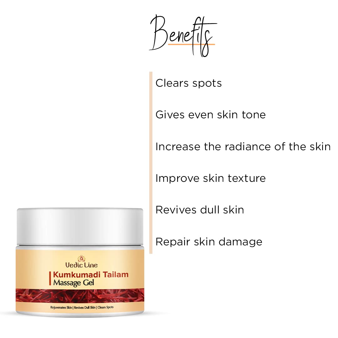 • Vedicline Kumkumadi Tailam Massage Gel helps to wrinkles blemishes spots and dark circles making your skin look younger and brighter.