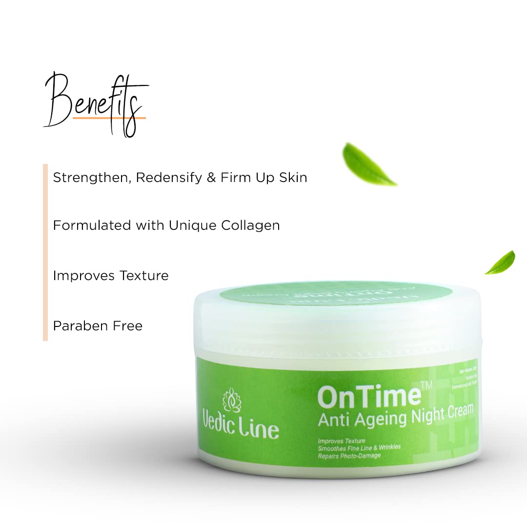 • Vedicline Ontime Anti-Ageing Night Cream Formulated to aging skin this night cream is supremely skin-rejuvenating. Skin is plumped and suppleness is increased and crow's feet are d dark circles vanish and a natural glow is stimulated.