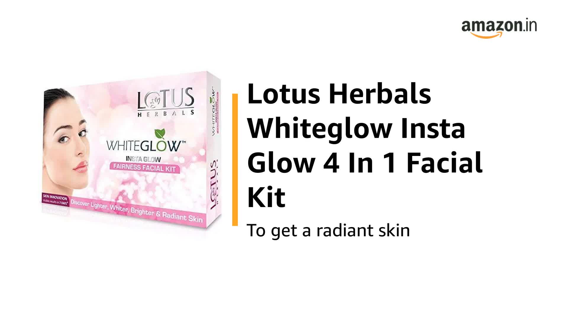 Product Description Whiteglow Insta Glow Fairness Facial Kit is a unique facial to discover lighter whiter brighter and truly radiant skin.This Facial gives the complete benefit of the ideal Whiteglow regimen. This kit nourishes as well as restores natural glow of skin instantly. From the Manufacturer Discover What's Inside How It Works?Whiteglow Whitening & Brightening Cleansing Milk : A unique breakthrough formula from Lotus Herbals. It is enriched with potent natural 41: extracts which gently exfoliate & remove dirt makeup and daily impurities while maintaining your skin's natural moisture balance & nourishing the skin from within. Whiteglow Oatmeal & Yogurt Skin Whitening Scrub : This unique scrub exfoliates the skin gently removes dirt impurities blackheads and whiteheads leaving your skin brighter and healthier with a shining glow. Oatmeal exfoliates gently restores the natural moisture balance and yogurt moisturizes & lightens the skin giving you silky smooth and brighter skin. Whiteglow Skin Whitening & Brightening Massage Cream : This luxuries massage Cream contains whitening actives that penetrate deep to lighten whiten and brighten skin while refreshing energizing and moisturizing the skin. It stimulates circulation polishes and tightens pores refines skin texture and leaves skin feeling soft & luminous. Whiteglow Yogurt Skin Whitening & Brightening Masque : This unique masque is enriched with Yogurt and Bearberry extracts. Yogurt is rich in lactic acid which is an active skin lightening agent. Bearberry has antiseptic properties hence is effective at cleansing disinfecting pores & fading freckles to reveal a fairer glowing skin.