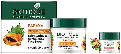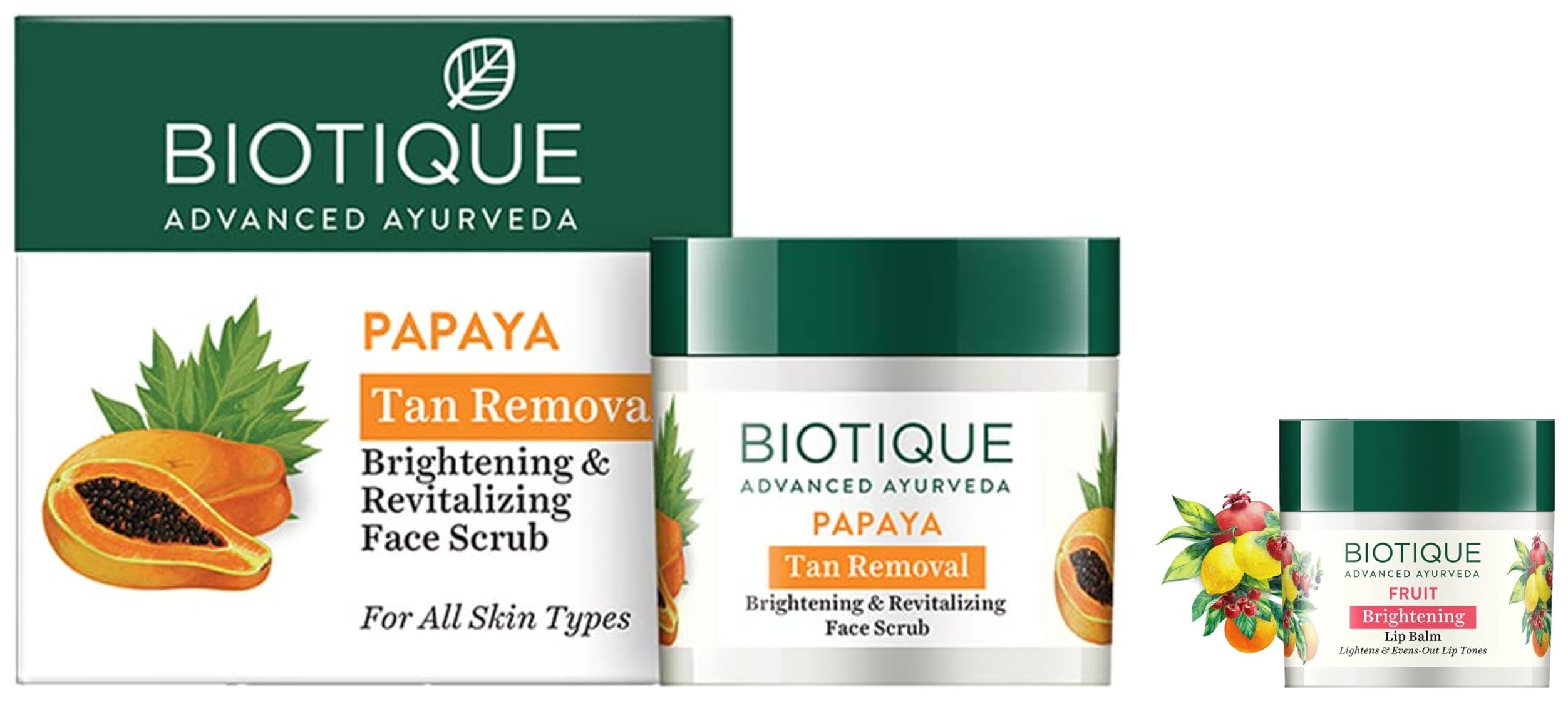 Biotique Bio Fruit Whitening Lip Balm 12gTreats scores swelling and dry dehydrated chapped lips. Restores natural suppleness of the lips.Biotique Bio Papaya Revitalizing Tan Removal Scrub 75gPapaya is a luscious tropic fruit with enzymes known for their revitalizing and healing benefits. It dissolves dead surface cells unclogs pore openings and smooth the way for clear skin to surface. Gentle refining action uncovers skin's natural brightness for a younger looking complexion.