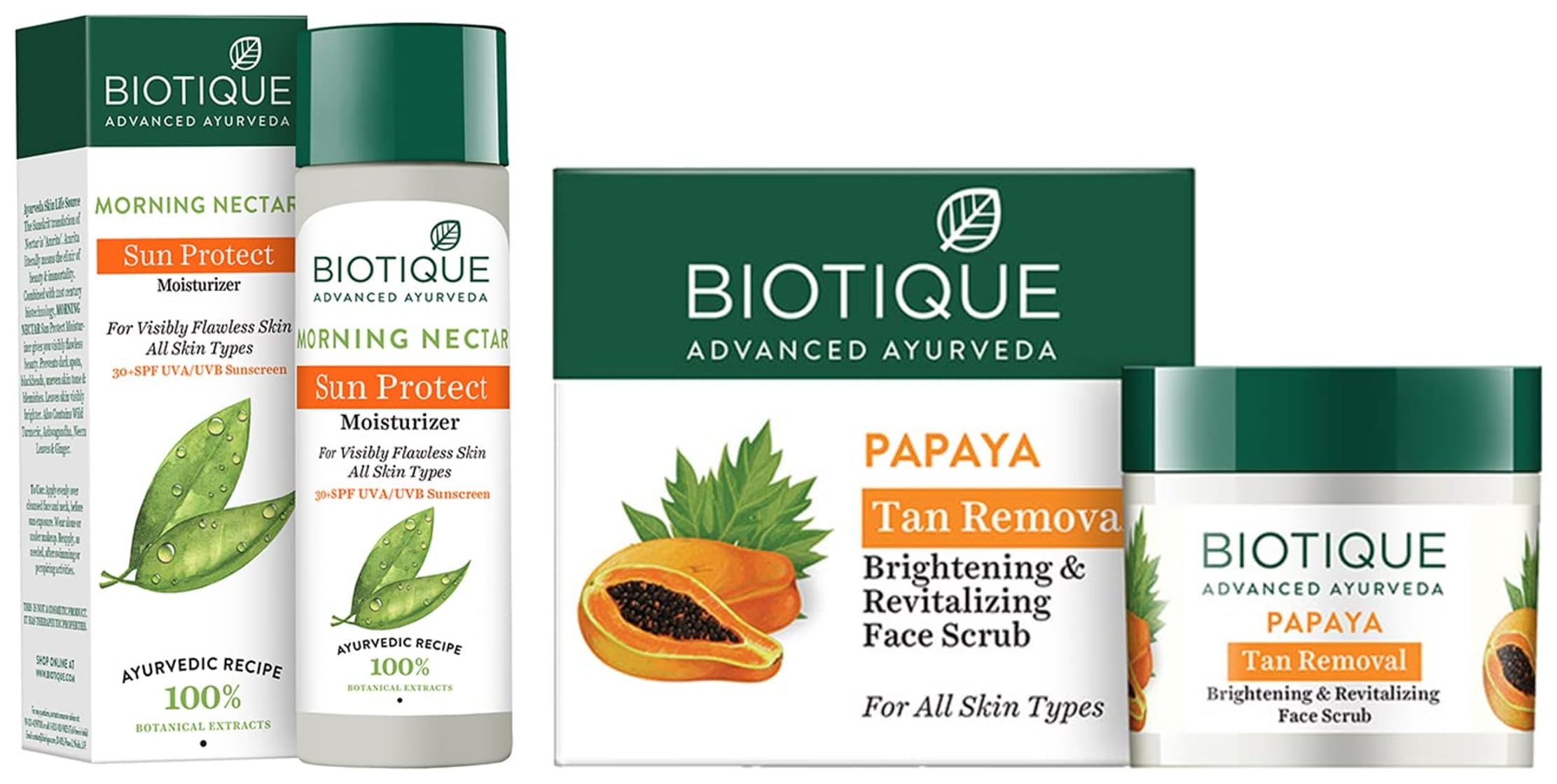 Biotique Bio Papaya Revitalizing Tan Removal Scrub 75gPapaya is a luscious tropic fruit with enzymes known for their revitalizing and healing benefits. It dissolves dead surface cells unclogs pore openings and smooth the way for clear skin to surface. Gentle refining action uncovers skin's natural brightness for a younger looking complexion.Biotique Bio Morning Nectar Sunscreen Ultra Soothing Face Lotion SPF 30+ 120mlThis nourishing and brightening lotion is blended with pure honey wheatgerm and seaweed. Replaces natural oils and replenishes lost moisture. Softens and brightens skin for a noticebly fairer complexion. Protects skin with SPF 30 UVA / UVB sunscreen. Ingredients : Ghritkumari (Aloe barbedensis) Methi (Trigo foenum graecum) Madhu (Honey) Ankurit gehun (Tritcum vulgare) Kusumbhi (Carthamus tinstorious) Lotion base Q.S. How to use : Apply evenly over cleansed face and neck before sun exposure each morning. Wear alone or under makeup.