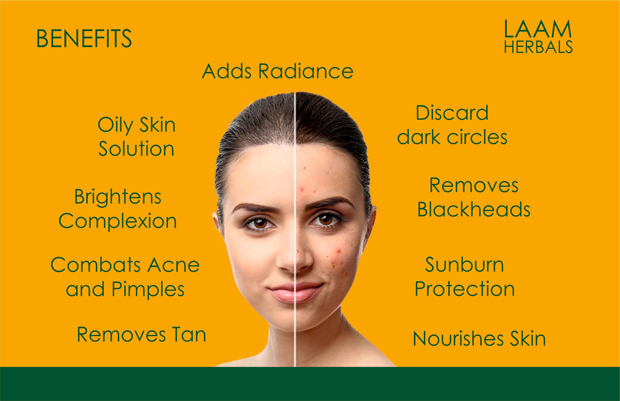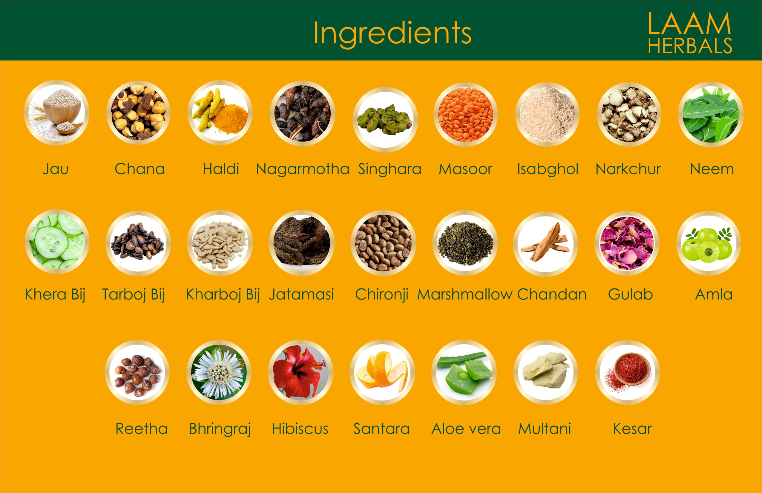 • PERFECT MIXTURE OF 18 AYURVEDIC NATURAL HERBS- INGREDIENTS: Wild Turmeric Almonds Rose Petals Sandalwood Aloe Vera Melon Seeds Masoor Pulse Watermelon Seeds Neem Orange Multani Mitti Chesnut Cucumber Seeds marshmellows Chickpeas Jasmin Jau & Kesar