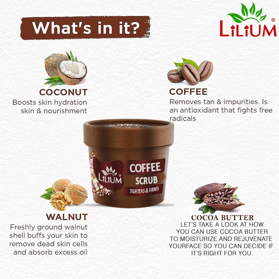 Lilium Coffee Scrub 100g For Moisture Lock With Age Defiance Ultra Glow Feel Fresh & Smoothness No Harmful Chemical & Paraben Free