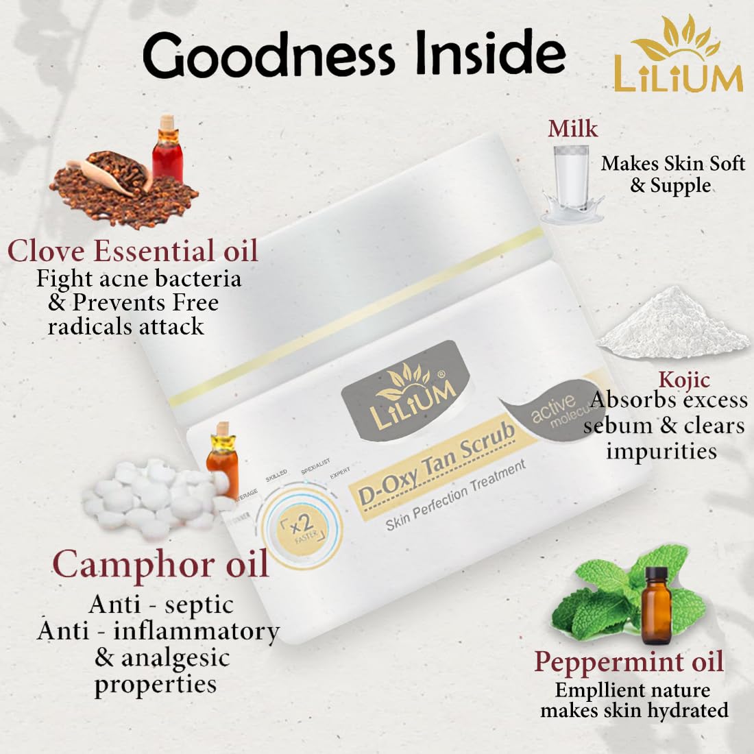 Lilium D Oxy Tan Scrub 40g | Tan Removal Exfoliating & Lighten Acne Marks | Decrease UV Damage With Kojic & Milk | Paraben Peroxide & Sulfate Free | De Tanning 100% Vegan Dermatologically Tested | Men & Women