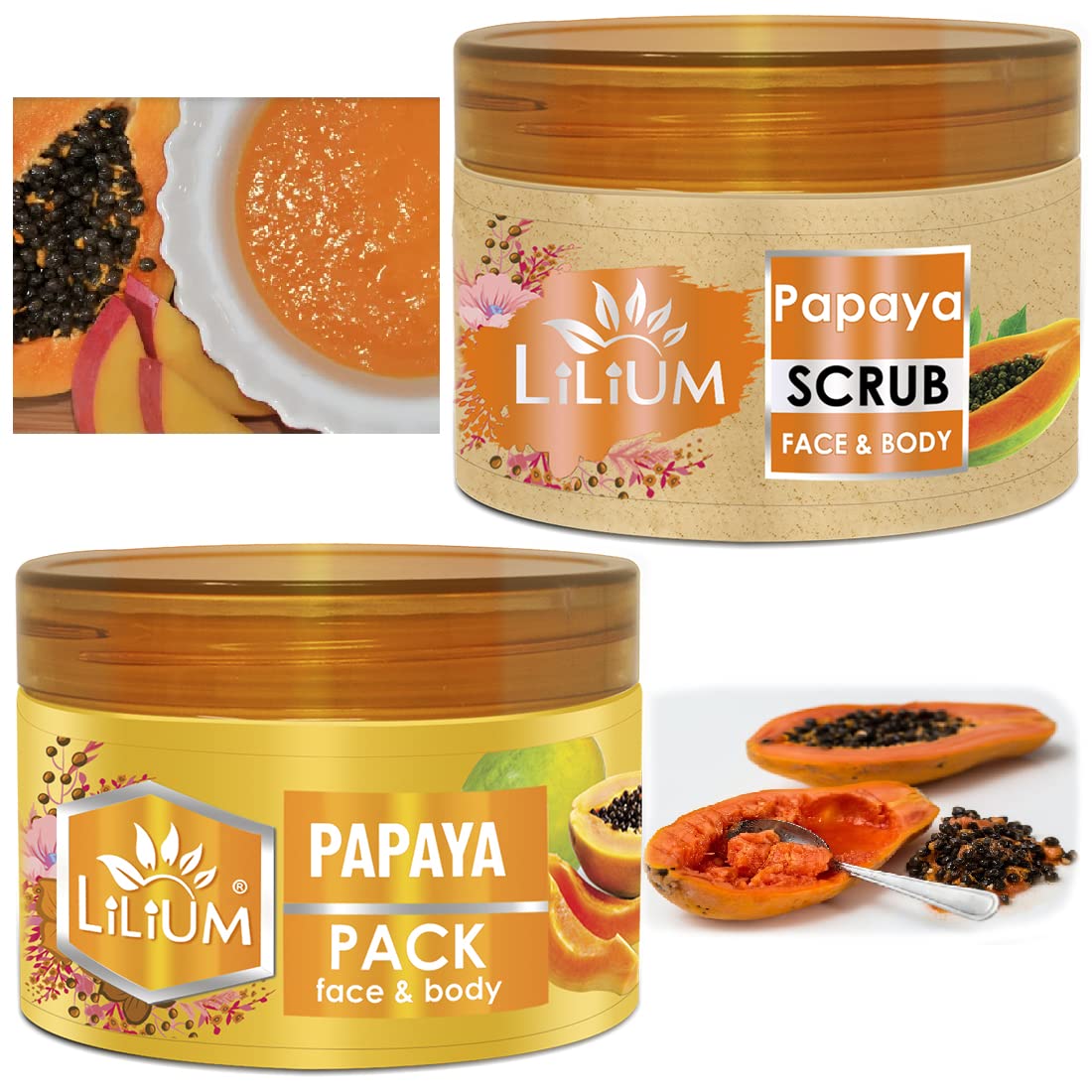 Lilium Papaya Scrub & Pack 250g Each | Enriched With Papaya & Aloe Vera Extract & Active vitamins B3 C E | Give Instant Radiance & Natural Glowing Skin Best Ror Oily Skin Cruelty Free Pack Of 2