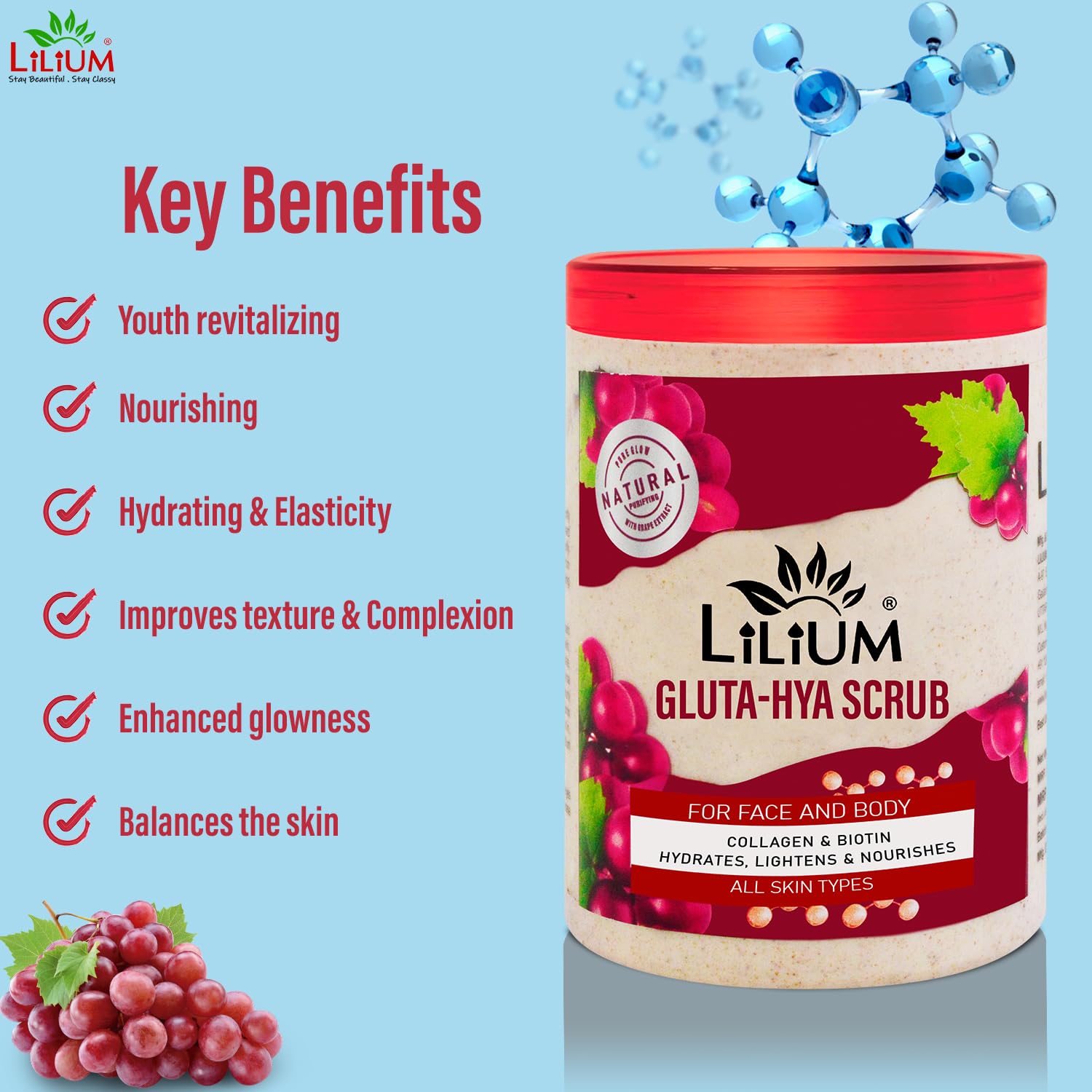 Lilium Revitalizing Massage Scrub Gluta-Hya 500ml | Collagen Biotin Hydrates Lightens & Nourishes | Minimizes Dermal Pores Helps Skin Retain Moisture 24x7 | For Face & Body All Skin Types