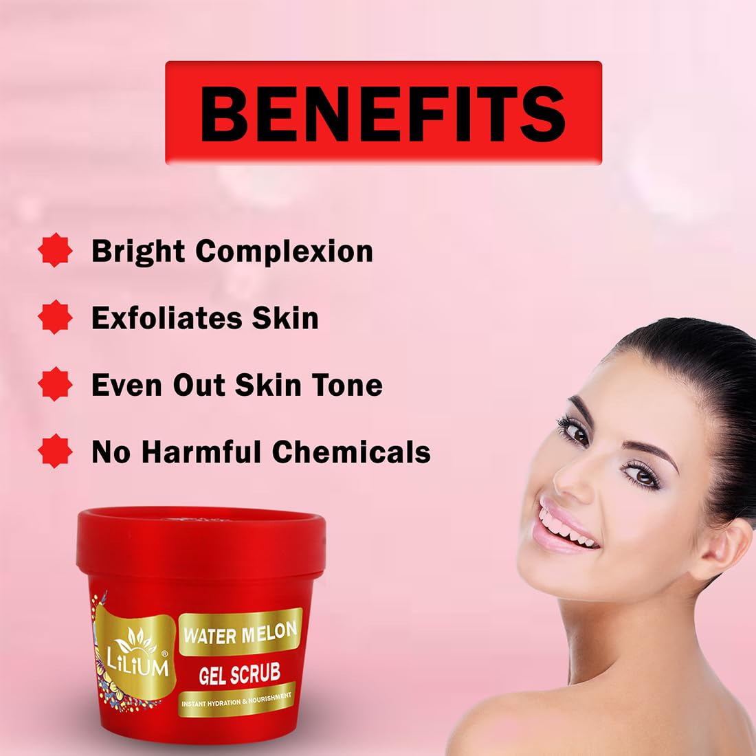 Lilium Water Melon Scrub is typically created with soothing herbal extracts scrub cleanser penetrate pores to clear out dirtLift away pore Clogging dust and excess oil makes skin clean. Smooth and healthy looking get fresh and flawless fairer skin.