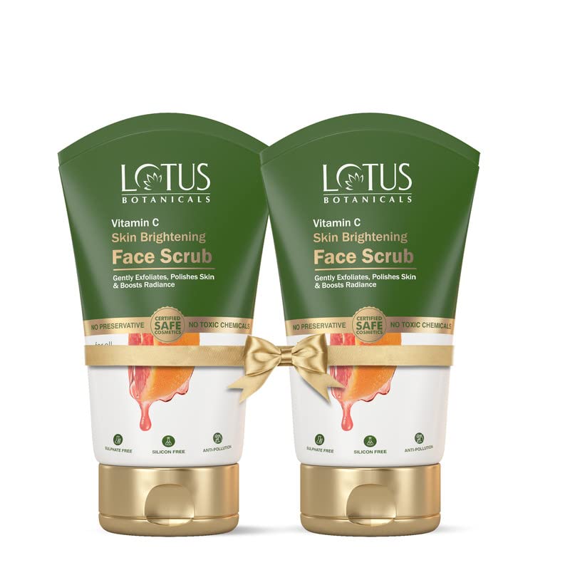 Lotus Botanicals Vitamin C Skin Brightening Face Scrub Infused with 300x Vitamin C power it exfoliates deep cleanses and removes impurities & dead skin. Easily removes dead skin deep-seated dirt Evens out skin tone and reveals a soft and supple skin while maintaining skin moisture and boosting skinâs radiance. Vitamin C energizes skin texture and reveals a super-smooth and luminous skin. No Toxic chemicals Preservative Free Paraben Free Silicon Free Sulphate Free Mineral Oil Free Anti-Pollution pH Balanced Cruelty Free 100% Vegan Recyclable Suitable for all skin type