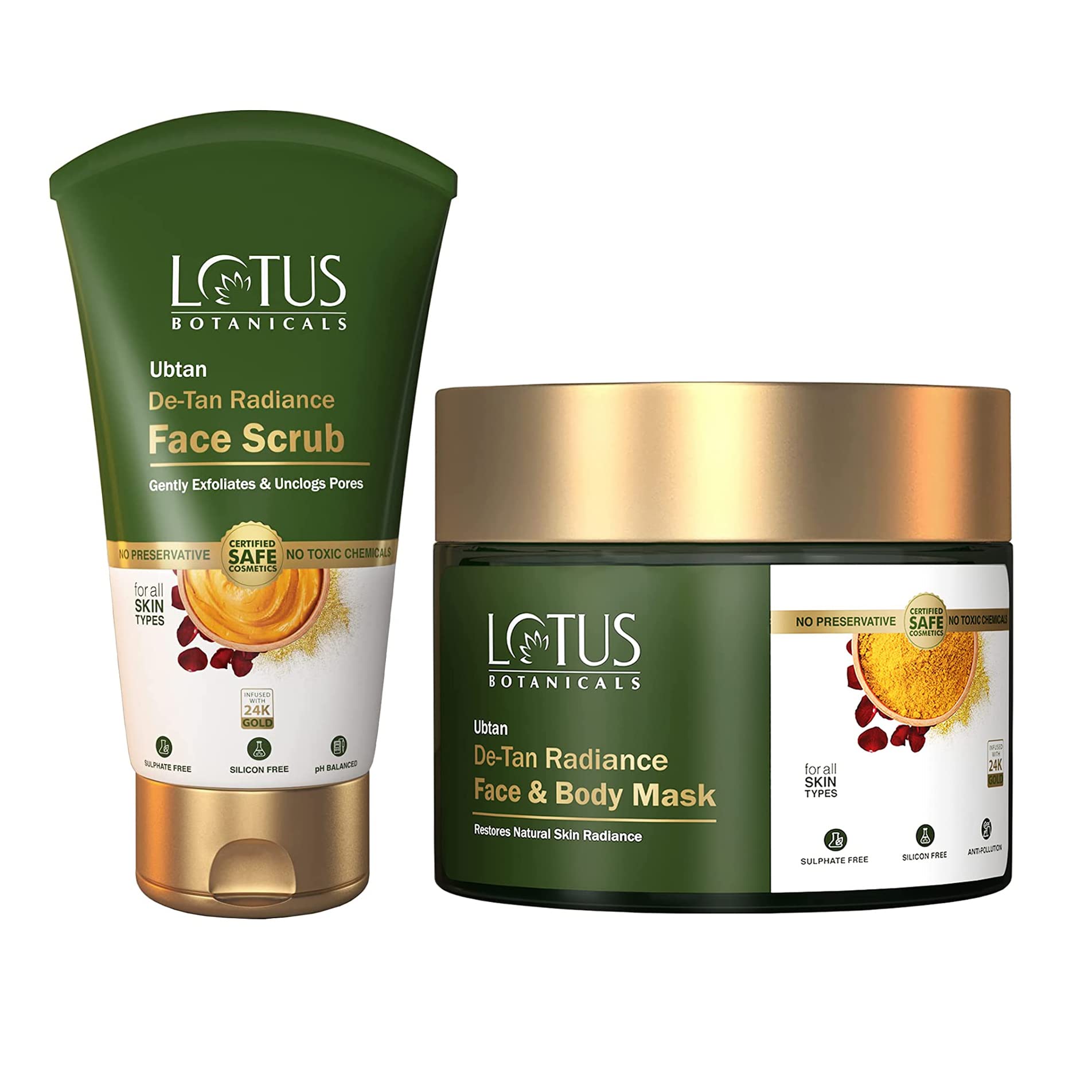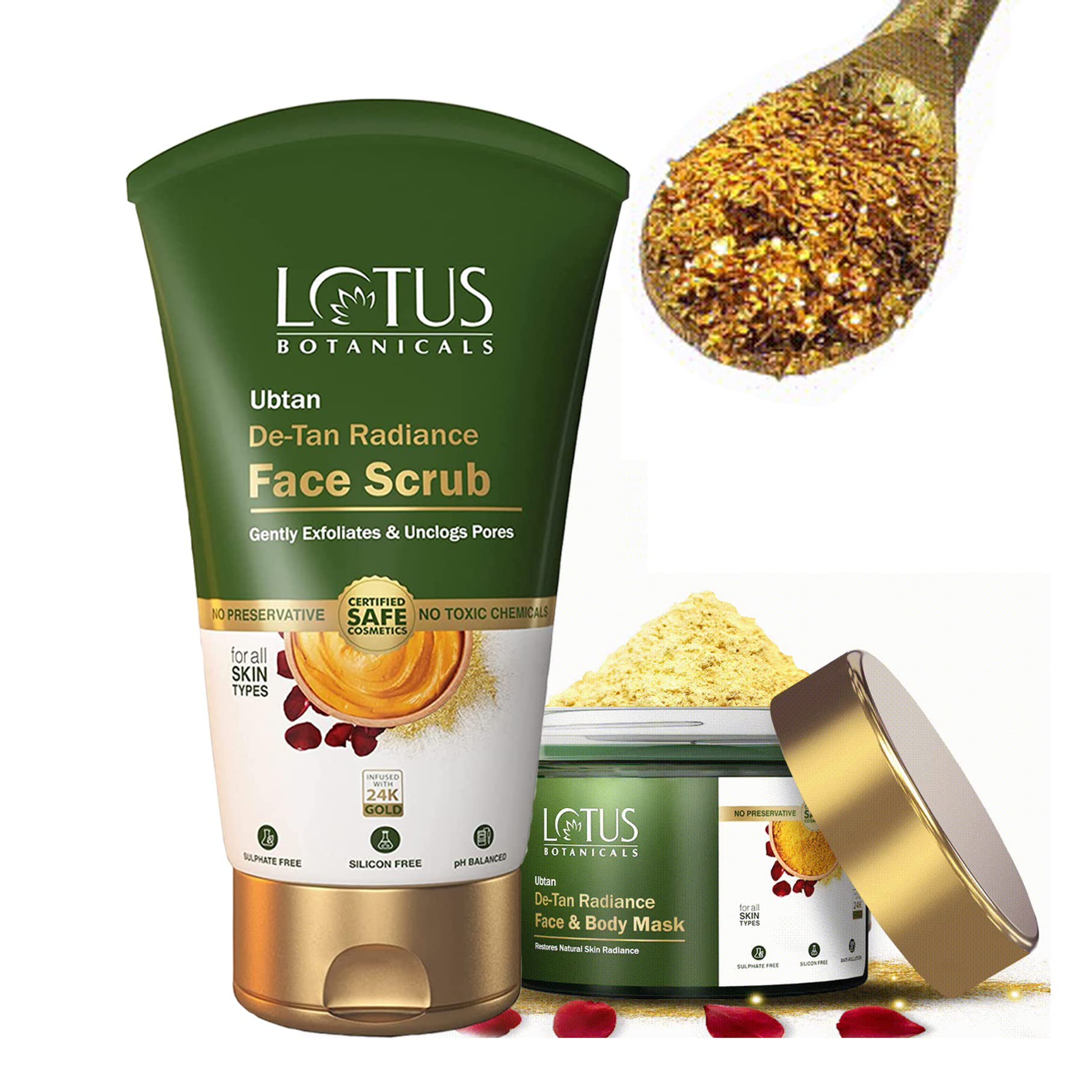 Lotus Botanicals Ubtan De-Tan Radiance Face Scrub 100ml With Ubtan De-Tan Radiance Face & Body Mask 140gm| Infused with 24K Gold | For Glowing & Rejuvenated Skin Anti-Tan | No Silicon