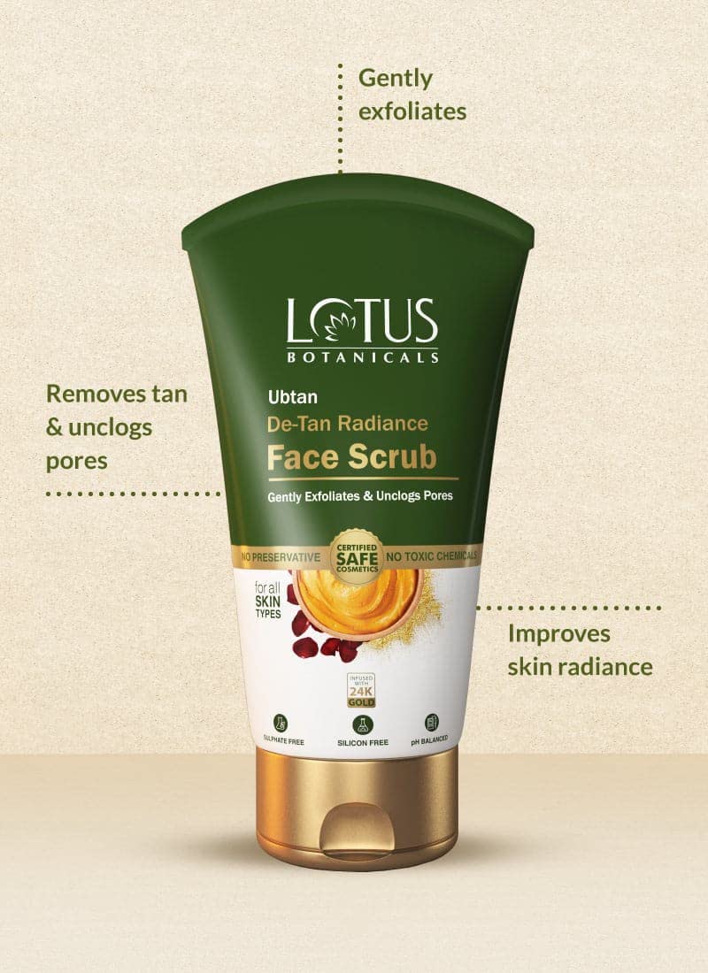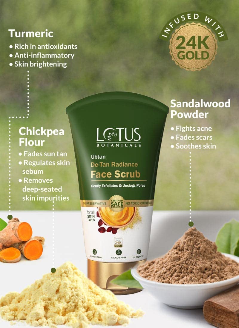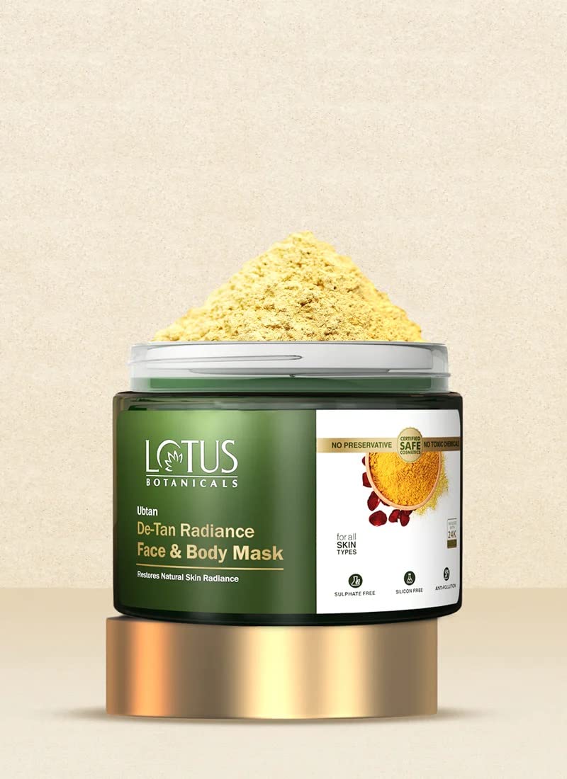Ubtan is an ancient Indian traditional skincare solution enriched with the goodness of natural ingredients that help lighten sun tanning brighten dull skin and leave your skin fresh & energized! Our Ubtan De-Tan Radiance Face Scrub contains powerful ingredients including turmeric rose chickpea powder sandalwood powder and 24k Gold that gently exfoliate impurities and dead skin cells to maintain radiant supple skin with an even skin tone. Key Benefits - Removes dead skin - Revives dull skin - Removes dirt and tan Lotus Botanicals Ubtan De-Tan Radiance face and body mask has coolant properties that help relieve your skin from excessive heat and tan. It treats your skin with the goodness of traditional ingredients like 24k gold chickpea sandalwood and turmeric. This face and body mask is a great exfoliator that takes away all the dirt and impurities from your skin. It gently nourishes your skin and strengthens your skin barrier. It helps maintain radiant supple skin with an even skin tone. Key Benefits - Reduces pigmentation and blemishes - Improves skin texture and elasticity - Restores your skinâs moisture & glow