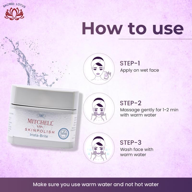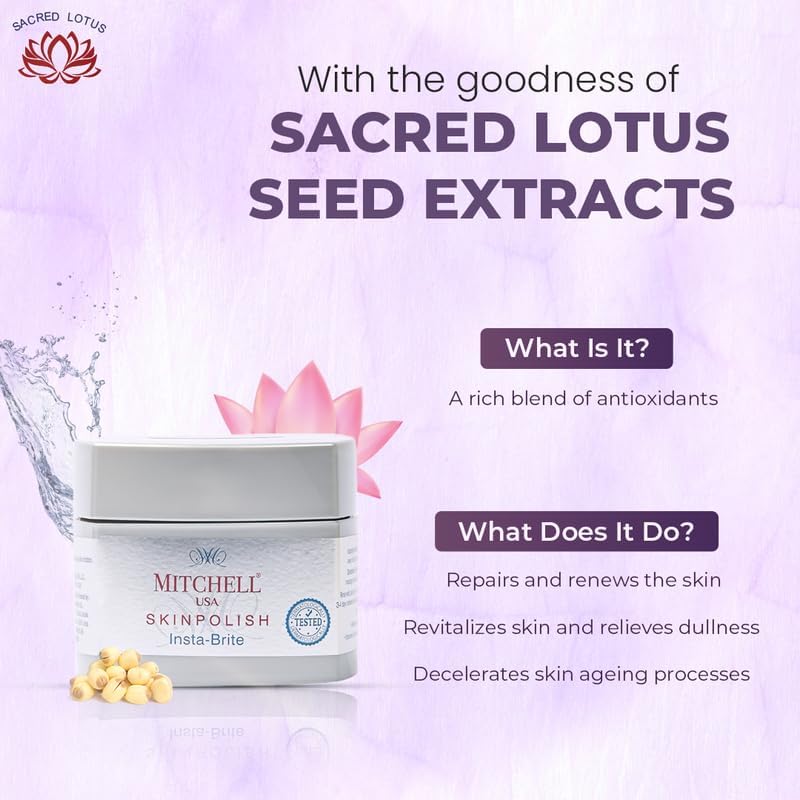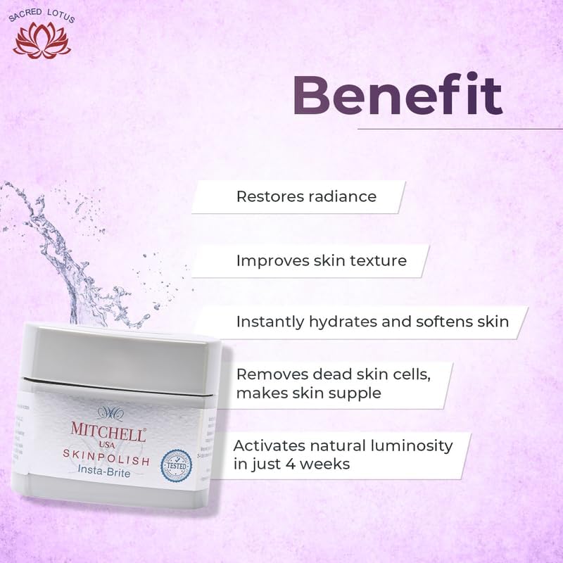 Mitchell USA Skin Polish Exfoliating Cream is enriched with Sacred Lotus in a unique formulation to gently exfoliate your skin. It makes your skin smoother and fresher looking after every application. This exfoliating cream with a unique formula especially for Indian skin clears dead cells off the surface and makes it easier for effective penetration and absorption of nutrients from facial products such as serums and creams.As an integral part of a skincare regimen it is vital to exfoliate or remove dead skin cells from the surface of the skin at least twice a week. Besides an ultra-gentle exfoliation Mitchell USA Skin Polish Exfoliating Cream instantly hydrates and softens skin besides improving skin texture.While an exfoliating cream for face tends to remove the dead keratinized skin cells from the surface skin polishing which is known as microdermabrasion is undertaken to address skin concerns such as acne fine lines and age spots.There's no need to choose a specific exfoliating cream for sensitive skin oily skin or dry skin anymore.This ultra-gentle exfoliating face cream with Sacred Lotus seeds extracts of Matricaria flower and Jojoba acts as an anti aging smooth skin repair cream as it instantly softens repairs brightens and improves texture of the skin. This soft skin cream restores youthful radiance making the skin glow almost instantly.Easy directions to use: Apply this luxurious rich skin polish generously to wet skin and massage gently for a minute. Rinse well. Use twice a week. For sensitive skin use this exfoliating skin polish only once a week.How it works: Matricaria flower Jojoba and Sacred Lotus seed extracts instantly hydrate the skin to make it more supple and reveal an even-toned complexion that gets better with time.Skin Type: All Skin TypesSafety: For external use only. In case of contact with eyes rinse with water.