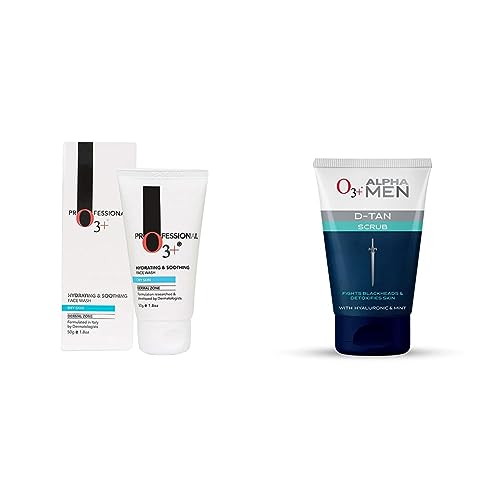 O3+ Hydrating & Soothing Face Wash with Aloe Vera and Cucumber Extracts 50g & O3+ ALPHA MEN Acno D-TAN Scrub With Hyaluronic & Mint 50g - Detan Scrub for TAN removal Combo