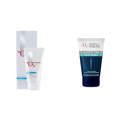 O3+ Milk Scrub Enriched with Macadamia Nuts Extracts for Clean & Bright Complexion & O3+ ALPHA MEN Acno D-TAN Face Wash with Tea Tree 100g for Oily Skin Combo