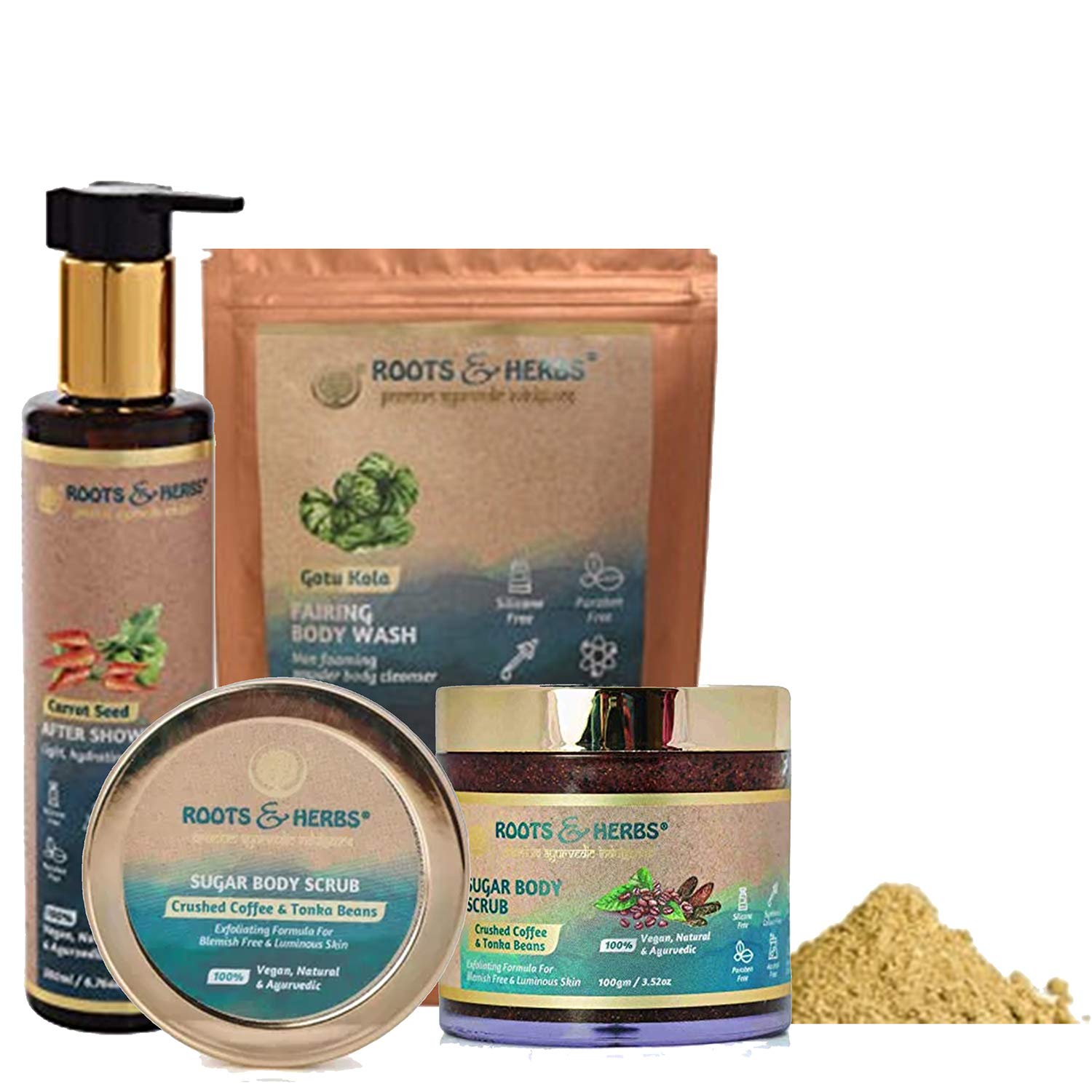 ROOTS AND HERBS Ayurvedic Natural Treatment 100% Vegan No Paraben No SLS No Sulphate-FOOT CARE REGIME-GOTUKOLA CARROTSEED OIL SUGAR BODY SCRUB COMBO PACK