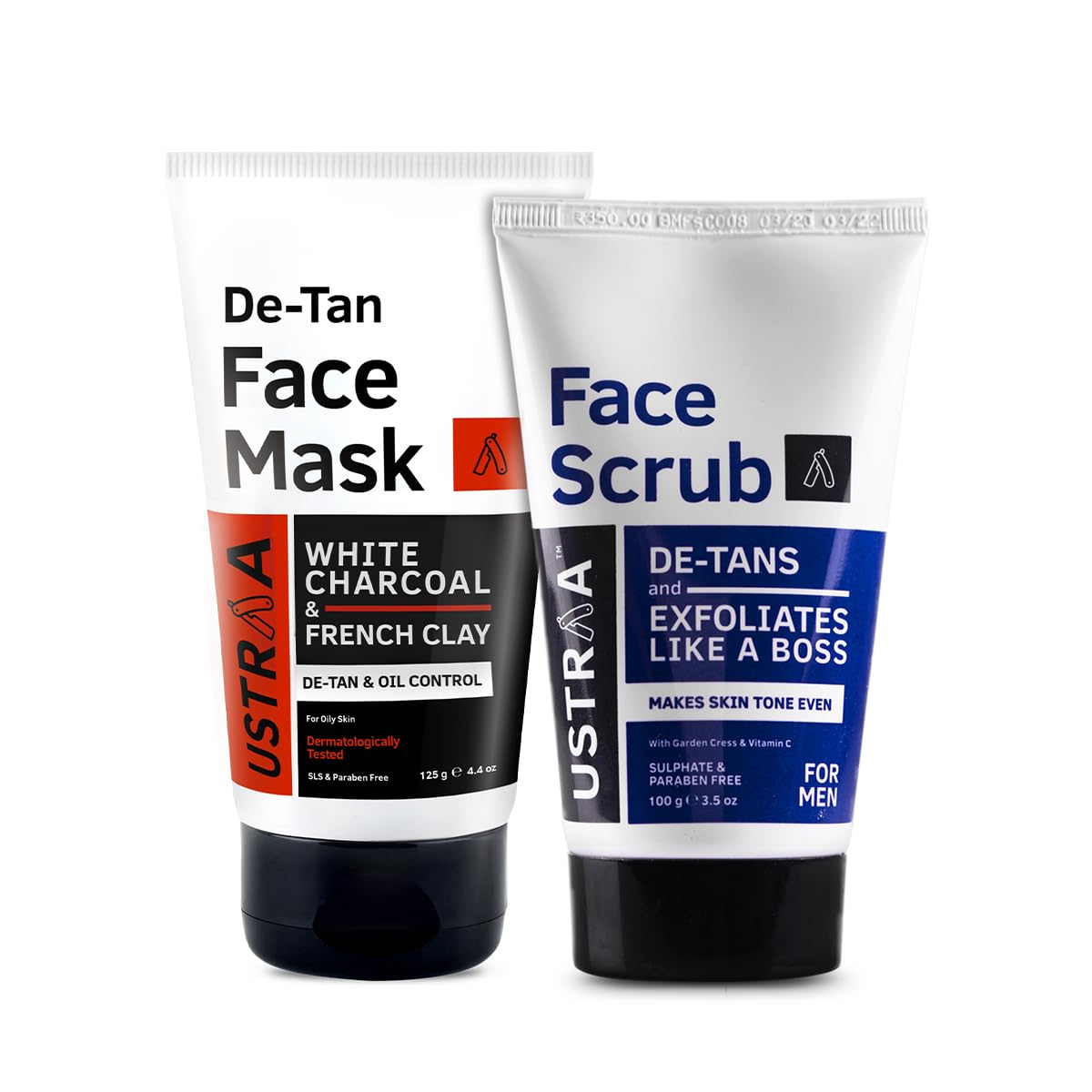 De-Tan Face Scrub - For men who spend a lot of time outdoor or sweat it out at the gym this is a must. While a face wash cleans your face the scrub penetrates into the pores of your skin and removes the dead skin. Making the skin healthier. Pollution stress lifestyle that involves eating a lot of junk food smoking or staying up late affects your facial skin health. This ultimately leads to pimples white-heads black heads uneven colour tone and dryness. The Ustraa face scrub helps repair your skin from all that and also de-tanning. With bigger walnut granule sizes it works more efficiently on a man's face as we men have thicker skin. Face Mask Oily Skin - This is a face mask designed to remove tanning and even out the skin tone. Skin that gets affected by prolonged sun exposure pollution and other irritants tends to gather impurities from the atmosphere which in the long run affects the skin and enhances aging. This mask helps to remove those impurities from the face and keep the face looking fairer younger and healthier. It also helps in excess oil removal. It is not a peel-off mask so it can be washed away with water only.