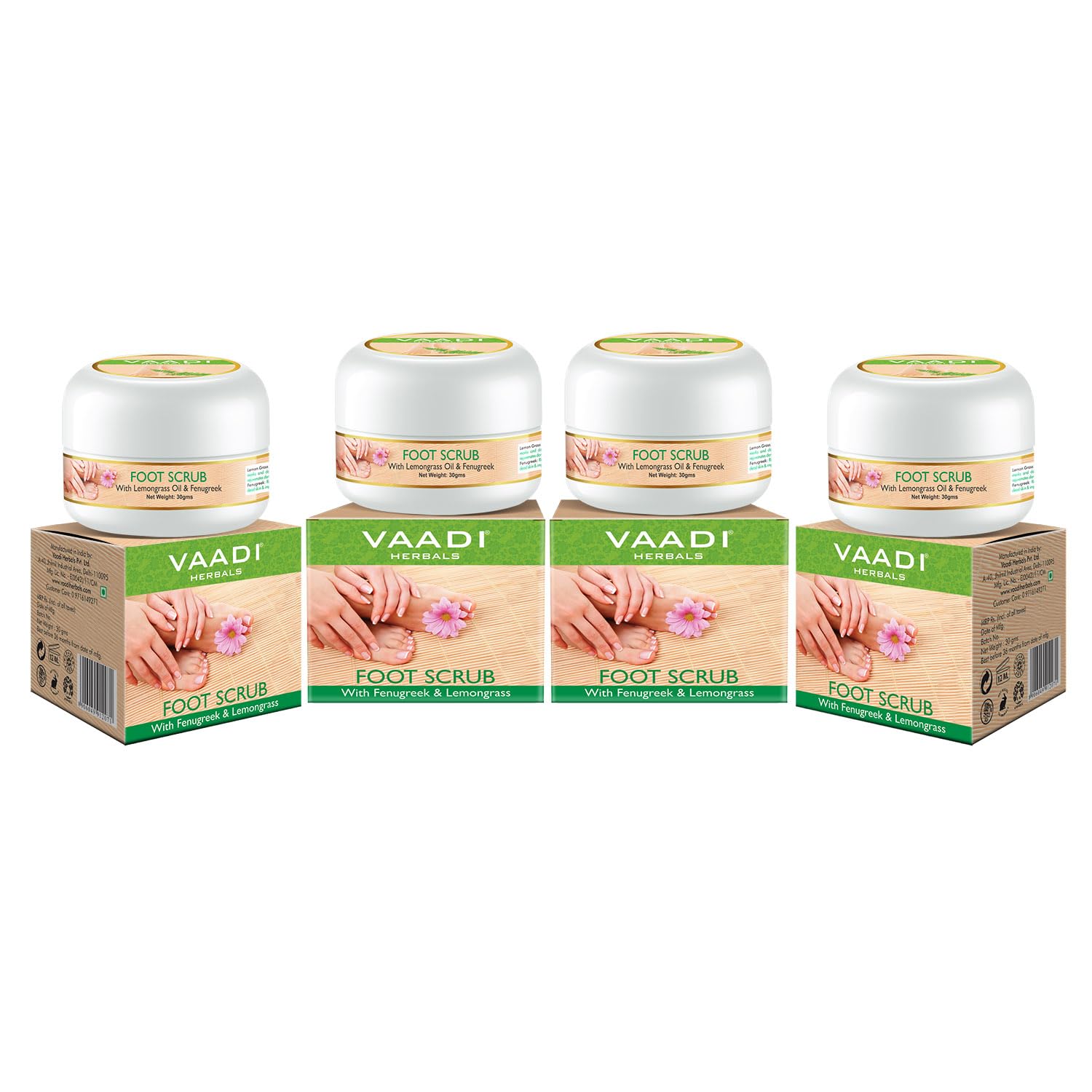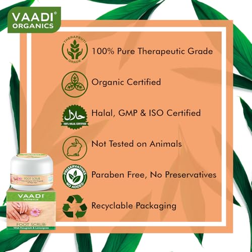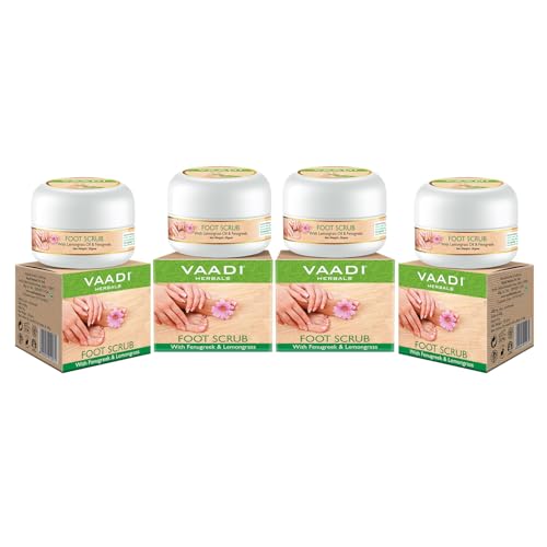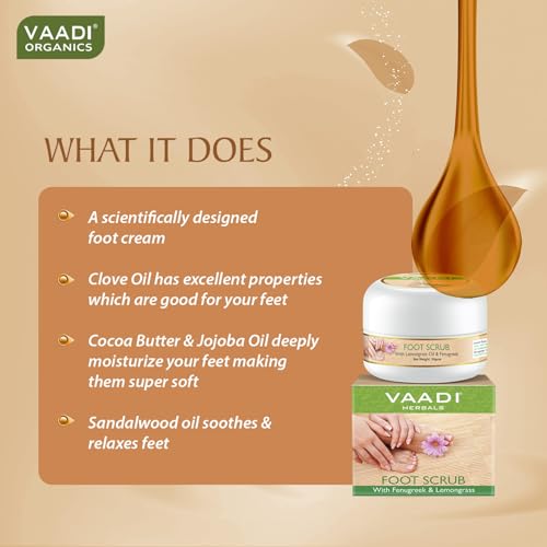 This uniquely designed foot scrub scientifically uses precious herbs and scrubs to effectively exfoliate dead foot tissues and rejuvenates the rough and damaged foot skin. Makes your feet super soft and supple. Why do our feet need scrubbing?Our skin follows a renewal cycle. New cells get produced in the inner layers; and travel to the surface while dying slowly. The resultant dead cells on the surface slough off maintaining the freshness of the skin. However with age this cycle gets disrupted. New cells grow slowly and dead cells slough off slowly. This causes accumulation of dead cells on the surface; making the skin look dull and unhealthy. On the other hand slower cellular renewal rate means hampered reparability of the skin. Scrubbing with the right products takes care of both these issues. It helps remove the dead cells from the surface revealing a healthier skin. And it stimulates production of new cells which keeps the skin looking healthy; helps maintain the elasticity and firmness; and even in repairing damaged skin of the feet.What benefits does Fenugreek render to this formulation?Fenugreek is known to exhibit anti-inflammatory action. Thus it helps greatly in reducing pain and swelling and relaxing tired feet. It is also known to treat sun-burn boils and other skin problems. It protects the skin against UV-induced damage too. Fenugreek or methi is also an excellent skin rejuvenator. Its property of a natural emollient keeps the feet soft supple and well-moisturized. Also being a rich source of Vitamin C it is granted anti-oxidant bleaching and toner properties. It fights signs of premature aging as well as lightens the skin tone and fades blemishes. It also deep cleanses the skin; removes dead skin cells; flushes out toxins; tightens pores and makes the skin glow.How do Jojoba Seed Grains prove useful for the scrub?Jojoba seed grains unlike other natural exfoliants are more uniform in shape and size. As such they happen to be less irritating to the skin in comparison. They gently unclog the skin pores by softening the blockage. They help in clearing the pores off impurities as well as removing dead skin cells from the surface without being harsh on the skin. This helps in reduction of dry flaky patches; and evening of the skin tone; while revealing a smoother and brighter skin.How effective is Lemongrass Oil in caring for the feet?Anti-septic anti-bacterial and anti-fungal properties of lemongrass oil help in treating as well as preventing foot infections; including athlete foot. And its analgesic action helps reduce inflammation as well as pain; thus soothing and easing over-worked feet. This oil obtained from fresh or partly-dried of leaves of Cymbopogon citrates grass is astringent in nature and it helps deep cleanse pores and shrink enlarged ones; thus keeping the skin firm. It is also known to alleviate perspiration; and strengthen connective tissue. Lemongrass oil also stimulates blood circulation and fluid flow by dilating vessels; which is imperative for health of cells.What is the need of using Walnut Scrub?Walnut shells being fibrous and hard are basically abrasive; and thus natural exfoliants. But walnut scrub is made of very finely powdered walnut shells. This makes the scrub both effective and gentle enough for our skin. Effective as the angular multi-faceted particles retain the abrasiveness of their source; and gentle because of the fine size of each particle. Walnut scrub helps rid the skin surface off accumulated dead cells; as well as clear other impurities that are not effectively removed by regular cleansers. It thus compensates for the skin slacking natural exfoliation process; gently smoothening and brightening the skin.What properties of Turmeric make it important in this regard?Turmeric contains a substance known as curcumin. This grants it anti-oxidant properties; which helps the skin maintain its youthfulness. It even stimulates cellular re-growth i.e. production of newer healthier cells to repair damaged skin. Curcumin also renders turmeric anti-inflammatory and skin lightening properties. This helps soothe irritated and inflamed skin; as well as lighten the skin tone and reduce the appearance of blemishes respectively. Furthermore turmeric is also known to stimulate blood circulation which is good for the health of the skin cells as well as relaxes tired feet. It is also beneficial in treatment of minor skin infections owing to its properties as an anti-bacterial and anti-septic agent.What role does Kokum Butter play in foot care?Sourced from the seeds of Garcinia indica kokum butter is an effective anti-oxidant with a rich content of Vitamin E. It delays the signs of aging while stimulating the growth of new cells; to repair damaged skin as well as to keep the skin looking healthy. Adding to this cause is the butter aid in oxygenation of cells; which betters the supply of essential nutrients to them. Kokum butter is also a natural emollient i.e. it increases the skin ability to absorb as well as retain moisture; making it an effective moisturizer to keep your feet supple. It is also known to reduce inflammation and calm irritated skin; as well as minimize the damage cause by the sun including skin peeling sunburn as well as sun-tan.