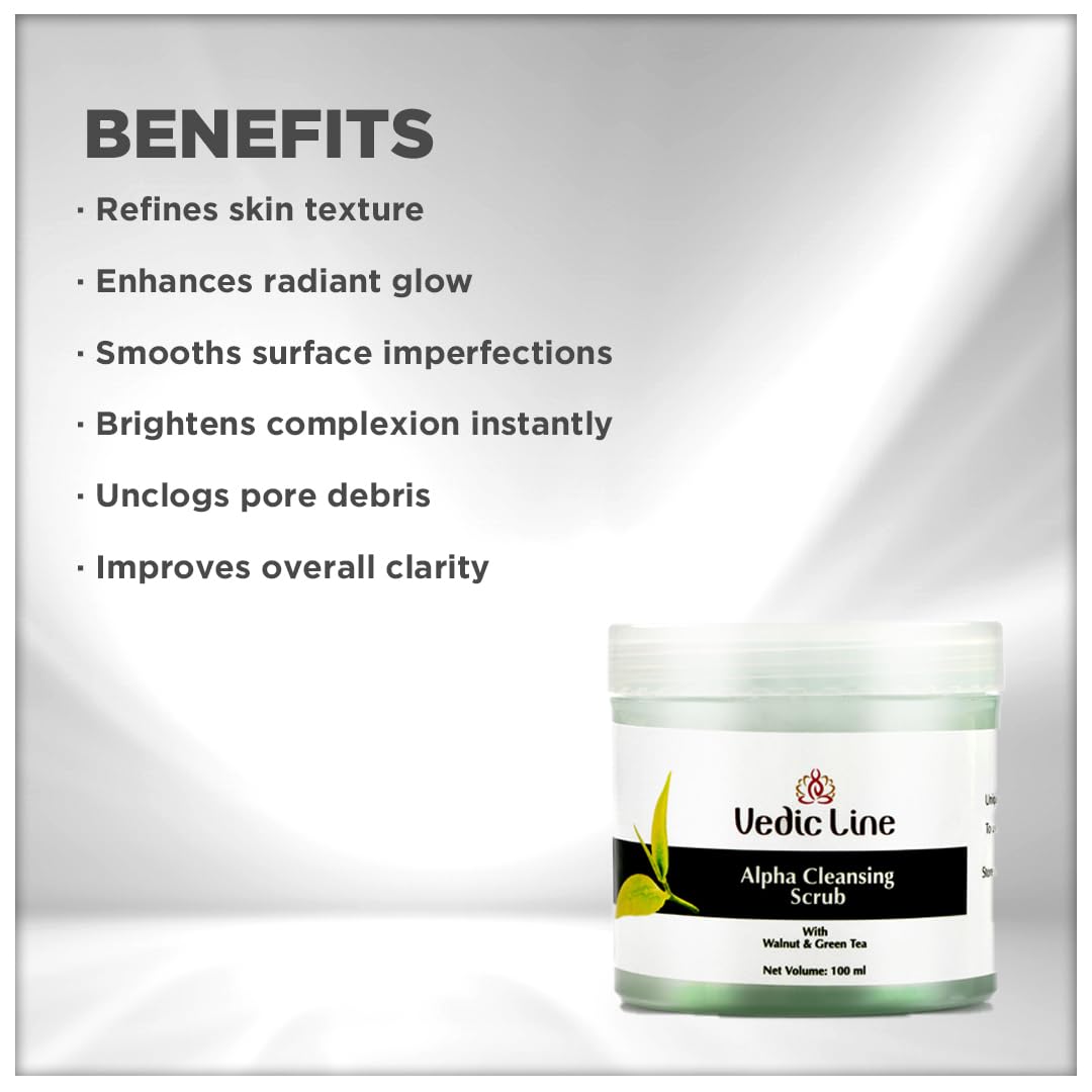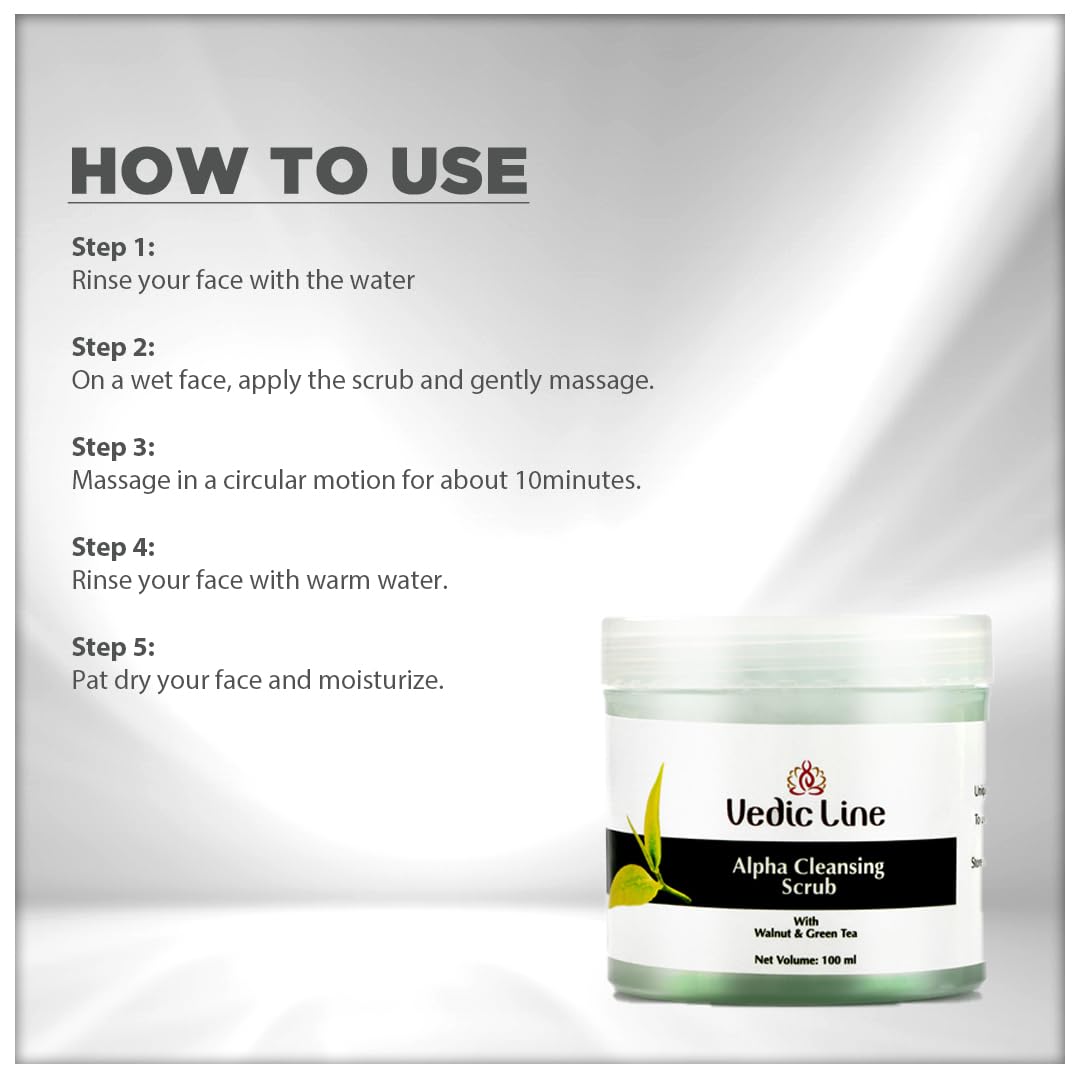 Vedicline Alpha Cleansing Scrub nourishes and revitalizes the skin making it smoother velvetier and more attractive. It assists in eliminating pollutants from the skin that can clog pores and stops the production of blackheads and whiteheads.