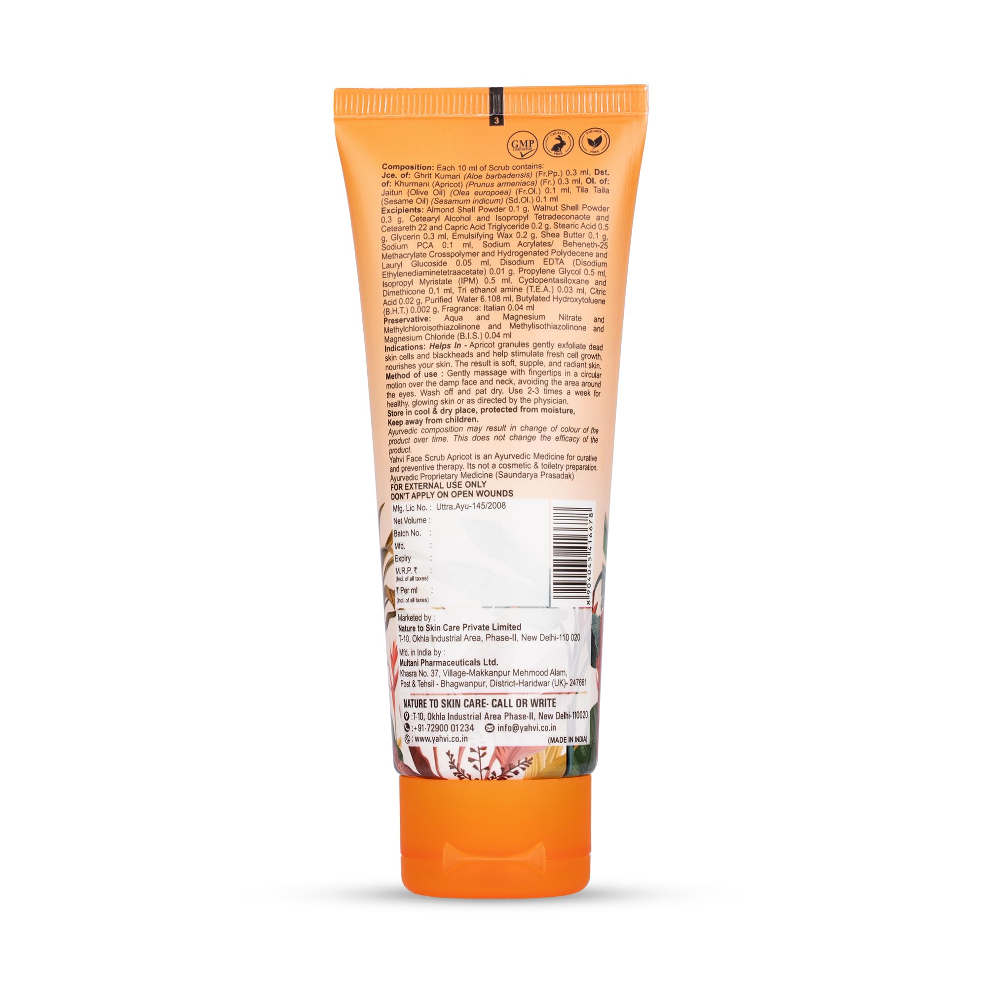 Yahvi Ayurvedic formula with genuine herbs and spices. Natural& organic Paraben -free cruelty-free . Yahvi Apricot Face Scrub has the ability to completely cleanse pores while also gently exfoliating dead skin. Apricots are high in essential fatty acids and vitamin A making them excellent for moisturizing dry irritated skin. It also moisturizes the skin's cells. Walnuts protect your skin from environmental aggressors like sun exposure dirt pollution and other impurities. Massage the scrub into damp skin for one minute then rinse and moisturize your face. Repeat once or twice a week.