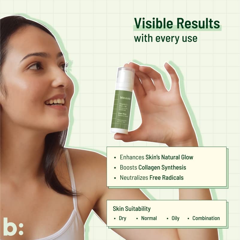 HomeHealth & PersonalSkin CareFace CareSerum & Lotionbiocule Ever Glow Radiance Vitamin C Face Serum Vitamin C with Glycolic Acid (AHA) from Kakadu Plum & Sugarcane for Glowing Skin Oil Free Serum for All Skin Types - 15ml