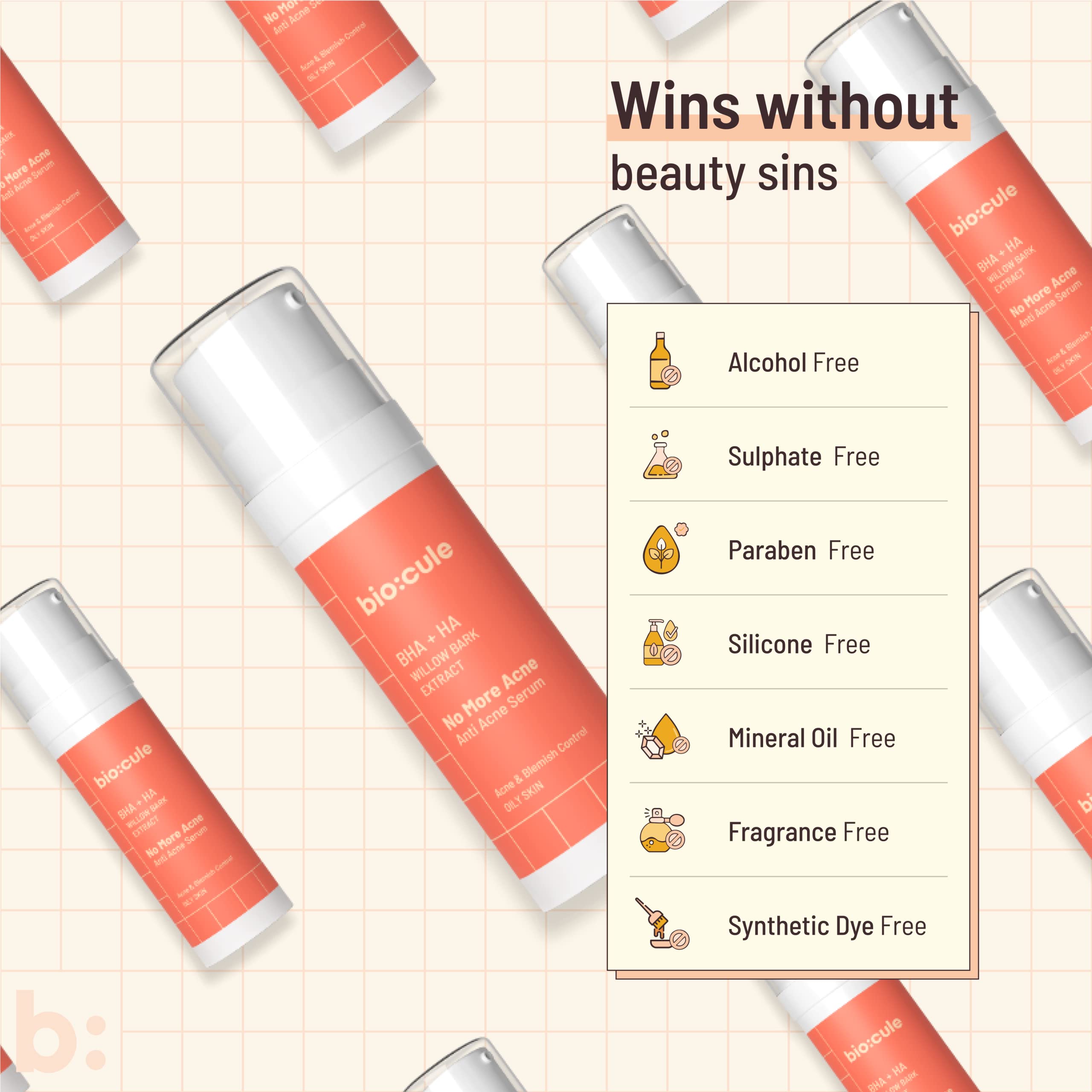 • FROM NATURE WITH SCIENCE : biocule No More Acne Salicylic Acid Serum contains a clinically proven combination of 8 botanical actives derived from Soybean Pear Willow Bark Amur Bark Neem along with Natural Hyaluronic Acid. This face serum for oily skin pur